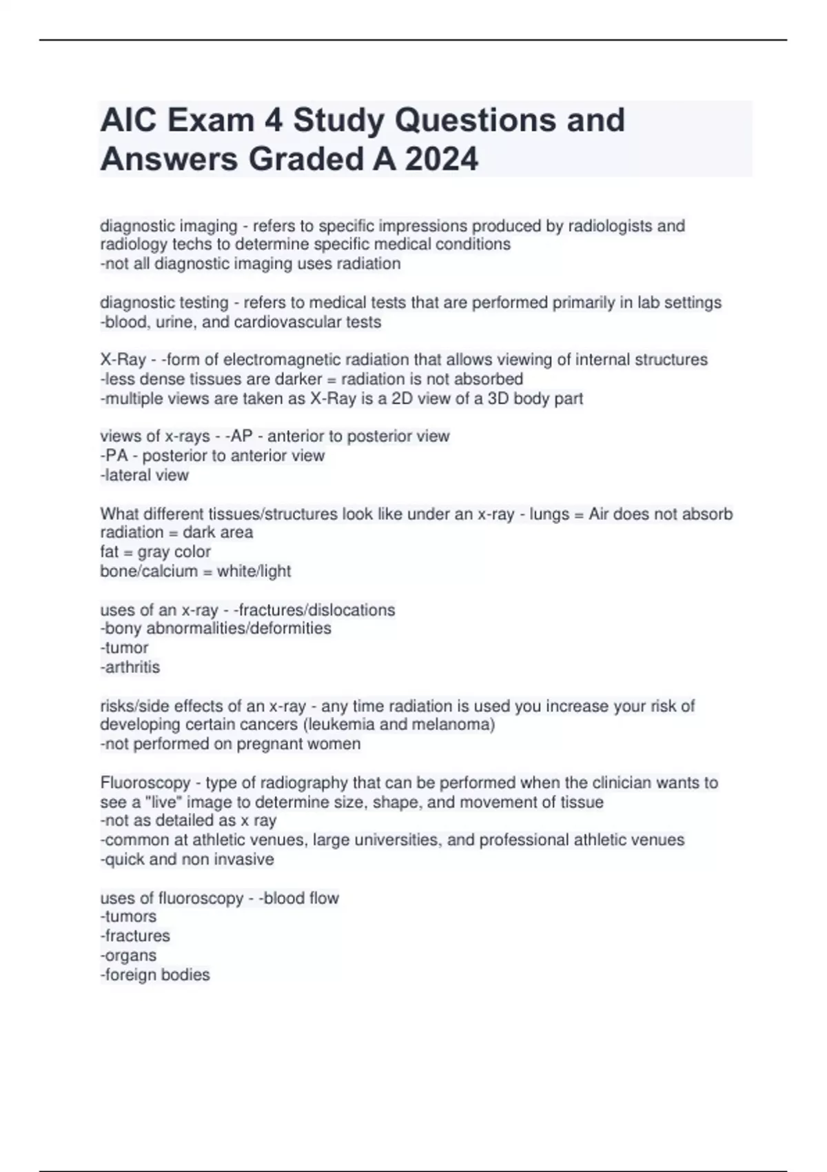 diagnostic imaging - refers to specific impressions produced by radiologists and radiology techs to determine specific medical conditions -not all diagnostic imaging uses radiation diagnostic testing - refers to medical tests that are performed primarily in lab settings -blood, urine, and cardiovascular tests X-Ray - -form of electromagnetic radiation that allows viewing of internal structures -less dense tissues are darker = radiation is not absorbed -multiple views are taken as X-Ray is a 2D view of a 3D body part views of x-rays - -AP - anterior to posterior view -PA - posterior to anterior view -lateral view What different tissues/structures look like under an x-ray - lungs = Air does not absorb radiation = dark area fat = gray color bone/calcium = white/light uses of an x-ray - -fractures/dislocations -bony abnormalities/deformities -tumor -arthritis risks/side effects of an x-ray - any time radiation is used you increase your risk of developing certain cancers (leukemia and melanoma) -not performed on pregnant women Fluoroscopy - type of radiography that can be performed when the clinician wants to see a "live" image to determine size, shape, and movement of tissue -not as detailed as x ray -common at athletic venues, large universities, and professional athletic venues -quick and non invasive uses of fluoroscopy - -blood flow -tumors -fractures -organs -foreign bodies -some soft tissue risks/side effects of fluoroscopy - any time radiation is used you increase your risk of developing certain cancers (leukemia and melanoma) CT Scan - computed tomography combines high resolution radiographs with computers to form a better internal structure in a cross-section or 3D -rotating x rays in a cross section "slice" put into a 3D image -patient must lie still and occasionally hold breath for the clearest image possible -painless but noisy -15-60 minutes uses of CT Scan - -internal organs -bones -soft tissues -blood vessels risks/side effects of CT Scan - -any time radiation is used you increase your risk of devloping certain cancers (leukemia and melanoma) -allergic reaction to contrast dye used is possible MRI - magnetic resonance imaging: applies magnetic field to the body -aligns with atoms in the body to produce radio waves to produce an image -takes 3D slices of the body image -all metal jewelry must be taken off before going in -watches, removal of dental implants, hearing aids, glasses, hair, accessories, writing utensils -safe for those with metal implants, screws, pins -lasts 30-60 minutes Contraindications: -pacemakers, implanted insulin pump, pregnant, gunshot wound, claustrophobia, tattoos or permanent makeup uses of MRI - -organs -soft tissues -bones -tumors -bleeding -infections risks/side effects of MRI - -none documented -claustrophobic individuals can request open MRI if available Ultrasound - high frequency sound waves that enter the body to produce images of internal structures in real time