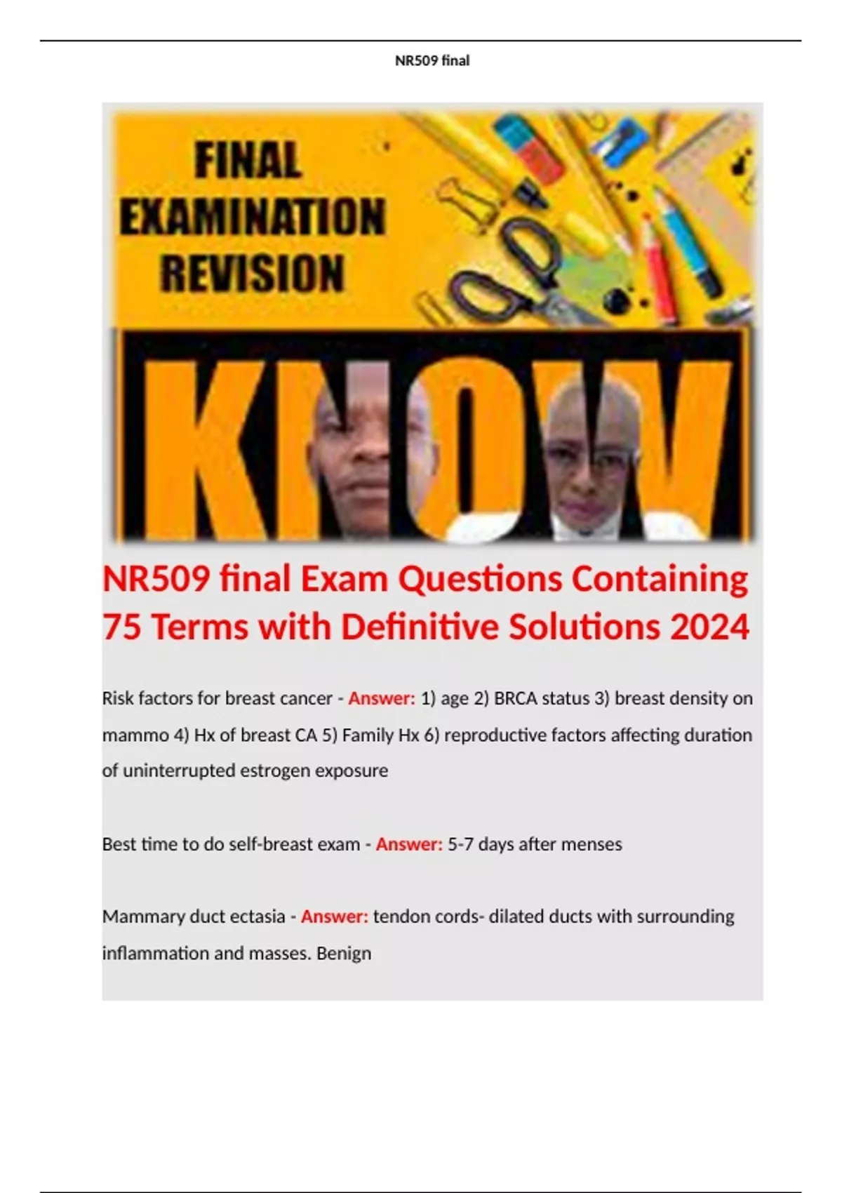 NR509 final Exam Questions Containing 75 Terms with Definitive Solutions 2024. Terms like: Risk factors for breast cancer - Answer: 1) age 2) BRCA status 3) breast density on mammo 4) Hx of breast CA 5) Family Hx 6) reproductive factors affecting duration of uninterrupted estrogen exposure