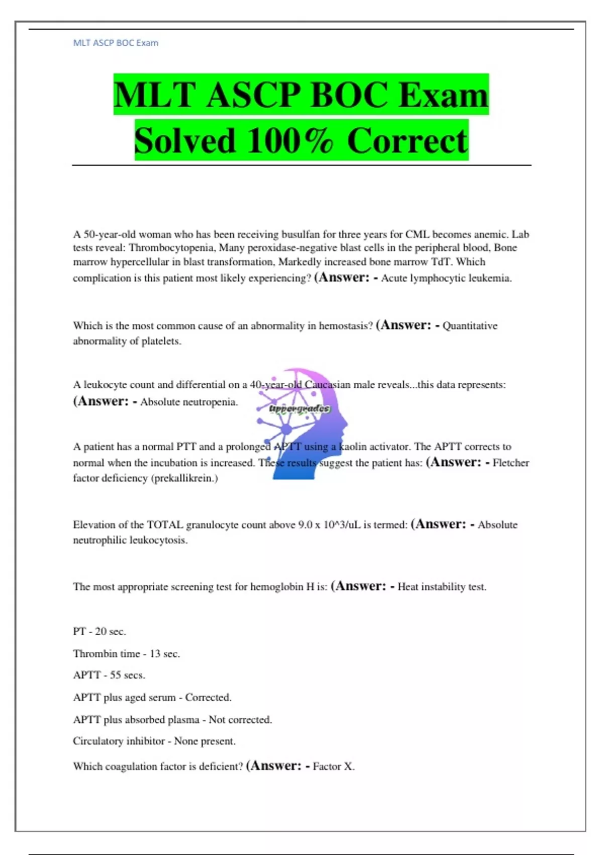 MLT ASCP BOC Exam Solved 100% Correct A 50-year-old woman who has been receiving busulfan for three years for CML becomes anemic. Lab tests reveal: Thrombocytopenia, Many peroxidase-negative blast cells in the peripheral blood, Bone marrow hypercellular in blast transformation, Markedly increased bone marrow TdT. Which complication is this patient most likely experiencing? (Answer: - Acute lymphocytic leukemia. Which is the most common cause of an abnormality in hemostasis? (Answer: - Quantitative abnormality of platelets. A leukocyte count and differential on a 40-year-old Caucasian male reveals...this data represents: (Answer: - Absolute neutropenia. A patient has a normal PTT and a prolonged APTT using a kaolin activator. The APTT corrects to normal when the incubation is increased. These results suggest the patient has: (Answer: - Fletcher factor deficiency (prekallikrein.) Elevation of the TOTAL granulocyte count above 9.0 x 10^3/uL is termed: (Answer: - Absolute neutrophilic leukocytosis. The most appropriate screening test for hemoglobin H is: (Answer: - Heat instability test. PT - 20 sec. Thrombin time - 13 sec. APTT - 55 secs. APTT plus aged serum - Corrected. APTT plus absorbed plasma - Not corrected. Circulatory inhibitor - None present. Which coagulation factor is deficient? (Answer: - Factor X.