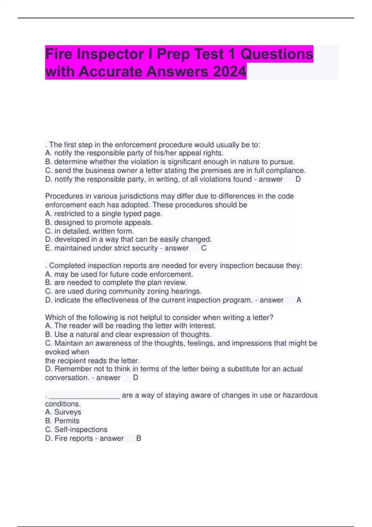 Fire Inspector I Prep Test 1 Questions with Accurate Answers 2024. The first step in the enforcement procedure would usually be to: A. notify the responsible party of his/her appeal rights. B. determine whether the violation is significant enough in nature to pursue. C. send the business owner a letter stating the premises are in full compliance. D. notify the responsible party, in writing, of all violations found D Procedures in various jurisdictions may differ due to differences in the code enforcement each has adopted. These procedures should be A. restricted to a single typed page. B. designed to promote appeals. C. in detailed, written form. D. developed in a way that can be easily changed. E. maintained under strict security C . Completed inspection reports are needed for every inspection because they: A. may be used for future code enforcement. B. are needed to complete the plan review. C. are used during community zoning hearings. D. indicate the effectiveness of the current inspection program. A Which of the following is not helpful to consider when writing a letter? A. The reader will be reading the letter with interest. B. Use a natural and clear expression of thoughts. C. Maintain an awareness of the thoughts, feelings, and impressions that might be evoked when the recipient reads the letter. D. Remember not to think in terms of the letter being a substitute for an actual conversation. D . _________________ are a way of staying aware of changes in use or hazardous conditions. A. Surveys B. Permits C. Self-inspections D. Fire reports B On a site plan, the north directional symbol usually points toward the: A. magnetic North Pole. B. right side of the page. C. top of the page. D. true North Pole C . There are four main views of working drawings. They include all of the following except the _________________ view A. sectional B. utility C. elevation D. detailed E. plan B When a citizen calls to report a suspected fire hazard, fire inspectors should: A. record all pertinent information. B. file the complaint for future action. C. forward the complaint to the Board of Appeals if immediate corrective action is required. D. consider the motivation for the complaint. A When investigating a complaint, a fire inspector should: A. never give the owner advance notice of the investigation. B. explain the purpose of the investigation to the owner. C. take appropriate departmental action to correct the violations. D. Both B and C are correct. D When an individual building or business owner feels that the local jurisdiction has made an improper code interpretation or decision, the individual may request a: A. hearing in district court or civil court, depending on the degree of hardship. B. hearing by the civilian review board. C. review by the Board of Appeals. D. more favorable ruling by the building inspector. c Prior to a court case, an inspector should do all of the following except: A. reinspect the facility the day before the trial. B. go over his/her testimony with the prosecutor before entering the courtroom. C. appear in proper uniform or be neatly dressed. D. volunteer information to make responses as detailed and complete as possible D . Which of the following is not suggested for courtroom procedure or behavior? A. Never become argumentative on the witness stand. B. Make sure that all physical evidence, exhibits, photographs, notes, and reference materials are brought to court. C. Attempt to answer a question you do not know. D. Remain impartial. Do not give the impression that you have a personal dislike for the defendant. C . According to NFPA 101, Life Safety Code, a building that provides sleeping facilities for four or more residents and is occupied by persons who are generally prevented from protecting themselves because of security measures not under their control, is classified as a/an: A. residential occupancy. B. occupancy of unusual structure. C. industrial occupancy. D. detention and correctional occupancy D . According to NFPA 101, Life Safety Code, buildings used as a store, market, and other rooms, buildings, or structures used to display and sell merchandise are classified as a/an: A. mercantile occupancy. B. business occupancy. C. storage occupancy. D. place of assembly. E. occupancy of unusual structures A Fire drills in educational occupancies should not be conducted: A. during classroom changes, since the students are already in the hallways. B. during assembly programs, since the students are all in one place making for easy evacuation. C. during lunch time. D. at the start of each day. D The purpose of school fire exit drills is to: A. increase speed in evacuating all children. B. instill discipline and order. C. ensure that all exits are being used and are not locked. D. ensure orderly exit of all personnel under controlled supervision. D A sketch depicting the general arrangement of the property in reference to streets, adjacent properties, and other important features is known as a: A. plot plan. B. sectional view. C. floor plan. D. blueprint. A Which item would not be considered during a field observation of a site for emergency access? A. Fire department access roadways which are wide enough to permit fire apparatus to operate and to pass B. Verification of code compliance for the storage, handling, and use of hazardous materials C. Physical, topographical, or architectural obstructions D. Adequate turning radius E. Whether access roads are within minimum building access distance requirements B . The temperature at which a liquid fuel, once ignited, will continue to burn is known as: A. fire point. B. vapor temperature. C. boiling point. D. flash point. A When a fuel gives off enough vapors so that it can be ignited and burn momentarily, it has reached its: A. fire point. B. upper flammable limit. C. vapor density. D. flash point. D Class B fires involve fuels such as: A. greases or flammable/combustible liquids. B. energized-electrical equipment. C. co