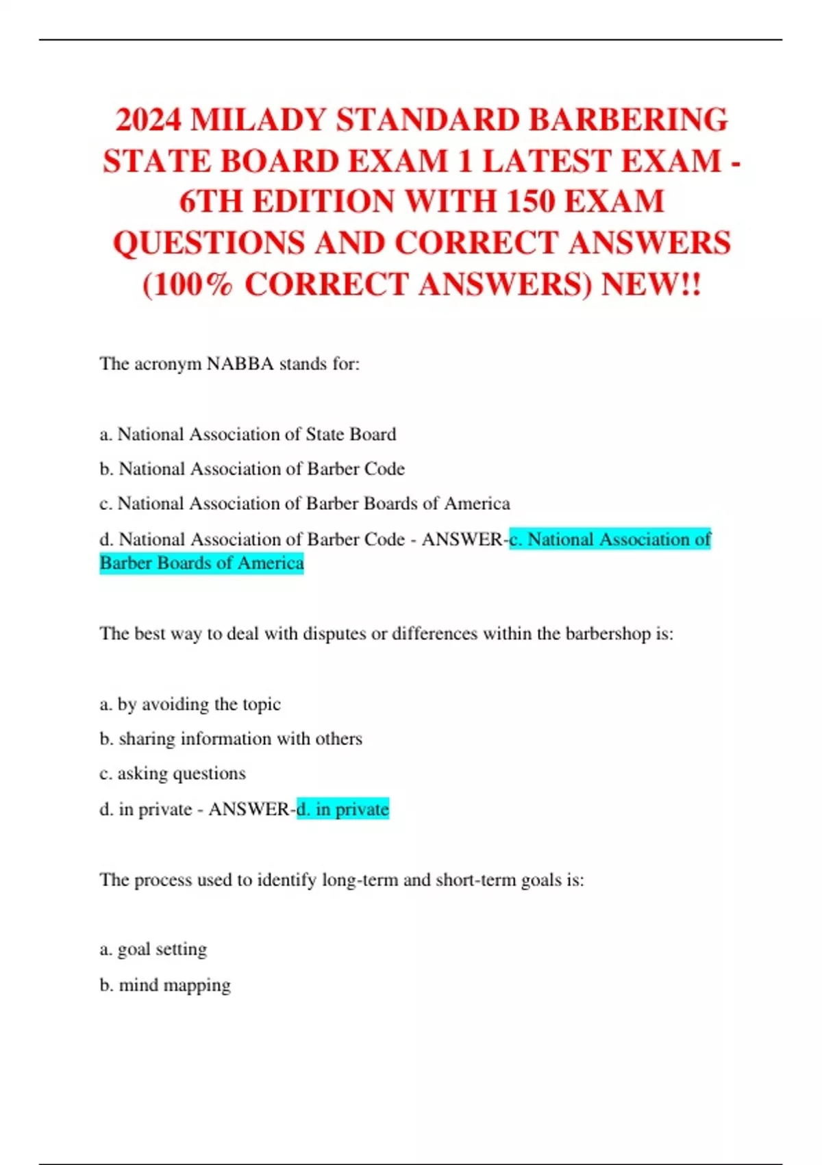 2024 MILADY STANDARD BARBERING STATE BOARD EXAM 1 LATEST EXAM - 6TH EDITION WITH 150 EXAM QUESTIONS AND CORRECT ANSWERS (100% CORRECT ANSWERS) NEW!! The acronym NABBA stands for: a. National Association of State Board b. National Association of Barber Code c. National Association of Barber Boards of America d. National Association of Barber Code - ANSWER-c. National Association of Barber Boards of America The best way to deal with disputes or differences within the barbershop is: a. by avoiding the topic b. sharing information with others c. asking questions d. in private - ANSWER-d. in private The process used to identify long-term and short-term goals is: a. goal setting b. mind mapping
