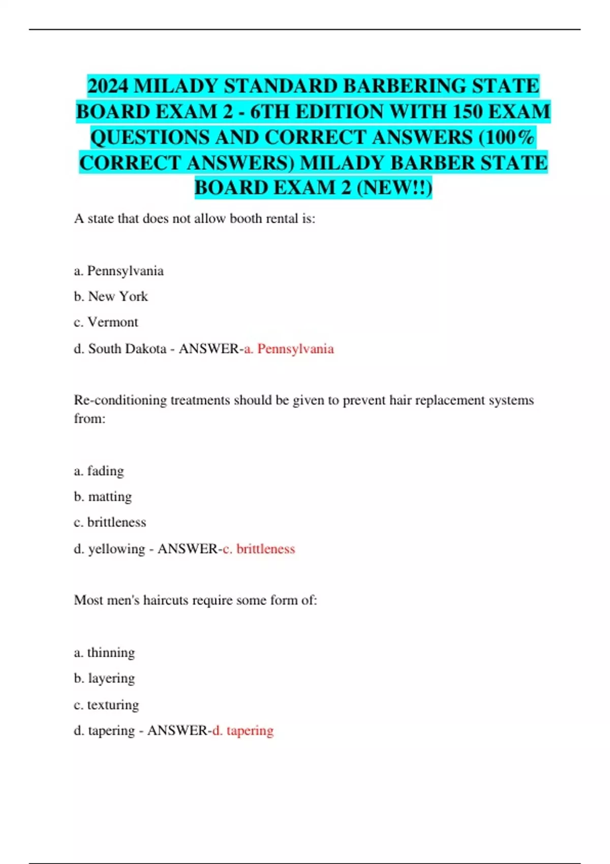 2024 MILADY STANDARD BARBERING STATE BOARD EXAM 2 - 6TH EDITION WITH 150 EXAM QUESTIONS AND CORRECT ANSWERS (100% CORRECT ANSWERS) MILADY BARBER STATE BOARD EXAM 2 (NEW!!) A state that does not allow booth rental is: a. Pennsylvania b. New York c. Vermont d. South Dakota - ANSWER-a. Pennsylvania Re-conditioning treatments should be given to prevent hair replacement systems from: a. fading b. matting c. brittleness d. yellowing - ANSWER-c. brittleness Most men's haircuts require some form of: a. thinning b. layering c. texturing d. tapering - ANSWER-d. tapering