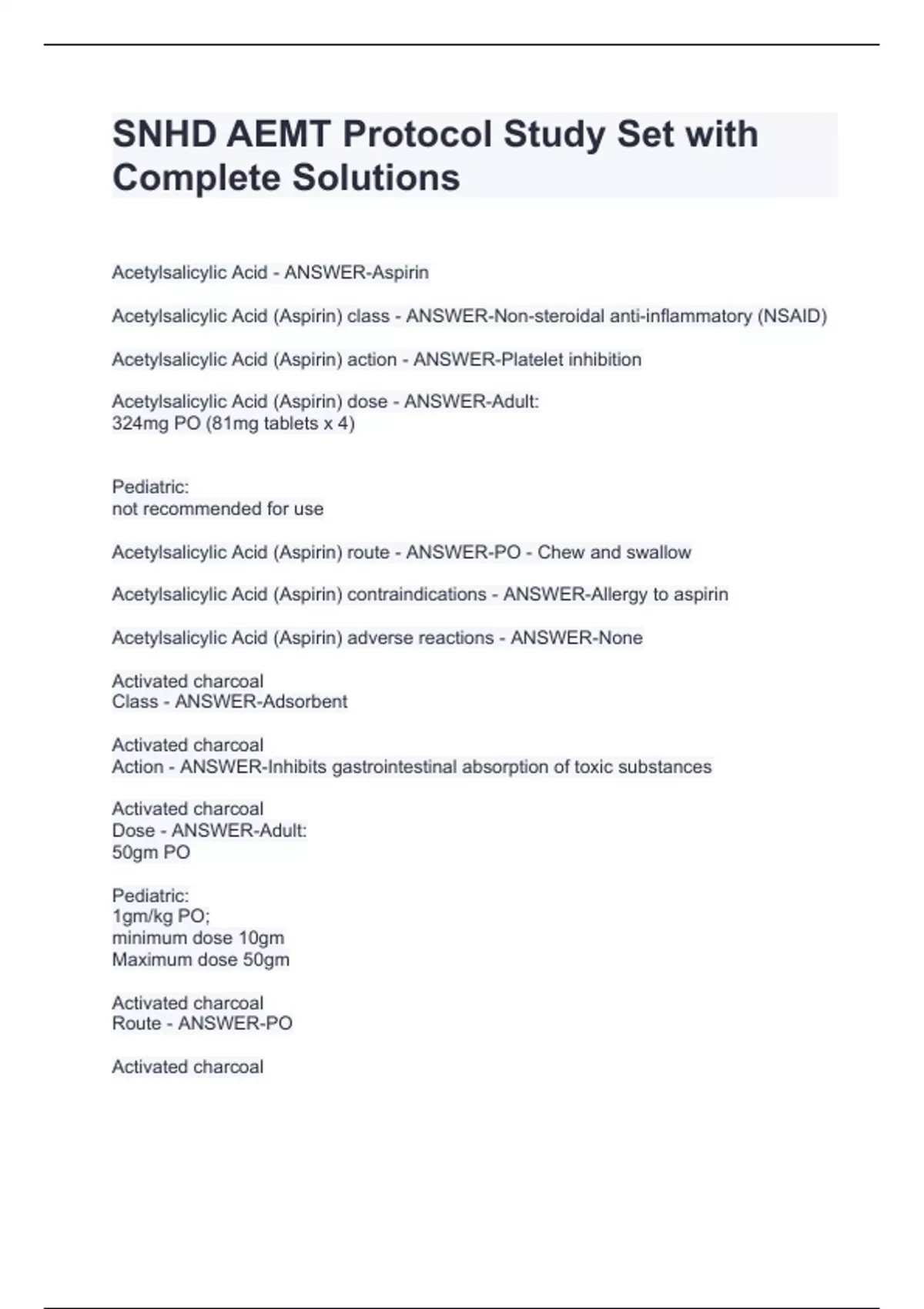 SNHD AEMT Protocol Study Set with Complete Solutions SNHD AEMT Protocol Study Set with Complete Solutions SNHD AEMT Protocol Study Set with Complete Solutions Acetylsalicylic Acid - ANSWER-Aspirin Acetylsalicylic Acid (Aspirin) class - ANSWER-Non-steroidal anti-inflammatory (NSAID) Acetylsalicylic Acid (Aspirin) action - ANSWER-Platelet inhibition Acetylsalicylic Acid (Aspirin) dose - ANSWER-Adult: 324mg PO (81mg tablets x 4) Pediatric: not recommended for use