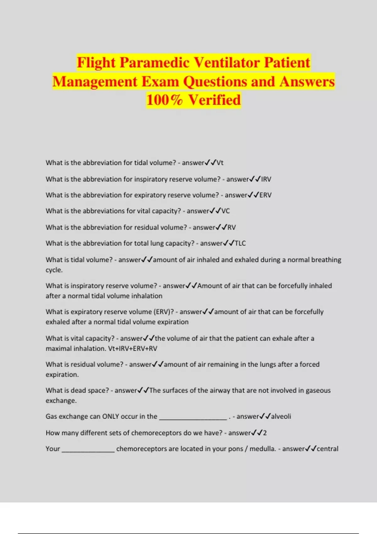 Flight Paramedic Ventilator Patient Management Exam Questions and Answers 100% Verified What is the abbreviation for tidal volume? - answerVt What is the abbreviation for inspiratory reserve volume? - answerIRV What is the abbreviation for expiratory reserve volume? - answerERV What is the abbreviations for vital capacity? - answerVC What is the abbreviation for residual volume? - answerRV What is the abbreviation for total lung capacity? - answerTLC What is tidal volume? - answeramount of air inhaled and exhaled during a normal breathing cycle. What is inspiratory reserve volume? - answerAmount of air that can be forcefully inhaled after a normal tidal volume inhalation What is expiratory reserve volume (ERV)? - answeramount of air that can be forcefully exhaled after a normal tidal volume expiration What is vital capacity? - answerthe volume of air that the patient can exhale after a maximal inhalation. Vt+IRV+ERV+RV What is residual volume? - answeramount of air remaining in the lungs after a forced expiration. What is dead space? - answerThe surfaces of the airway that are not involved in gaseous exchange. Gas exchange can ONLY occur in the __________________ . - answeralveoli How many different sets of chemoreceptors do we have? - answer2 Your ______________ chemoreceptors are located in your pons / medulla. - answercentral