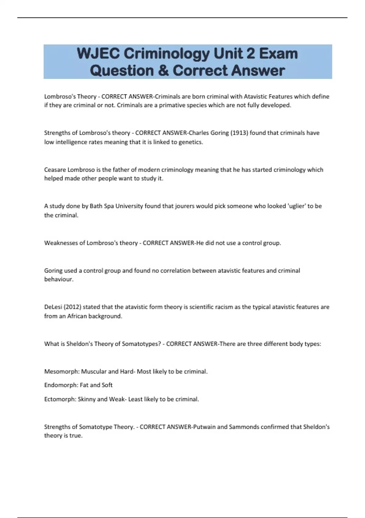 WJEC Criminology Unit 2 Exam Question & Correct Answer Lombroso's Theory - CORRECT ANSWER-Criminals are born criminal with Atavistic Features which define if they are criminal or not. Criminals are a primative species which are not fully developed. Strengths of Lombroso's theory - CORRECT ANSWER-Charles Goring (1913) found that criminals have low intelligence rates meaning that it is linked to genetics. Ceasare Lombroso is the father of modern criminology meaning that he has started criminology which helped made other people want to study it. A study done by Bath Spa University found that jourers would pick someone who looked 'uglier' to be the criminal. Weaknesses of Lombroso's theory - CORRECT ANSWER-He did not use a control group. Goring used a control group and found no correlation between atavistic features and criminal behaviour. DeLesi (2012) stated that the atavistic form theory is scientific racism as the typical atavistic features are from an African background. What is Sheldon's Theory of Somatotypes? - CORRECT ANSWER-There are three different body types: Mesomorph: Muscular and Hard- Most likely to be criminal.
