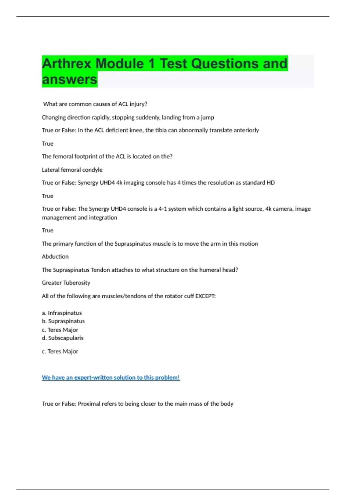 What are common causes of ACL injury? Changing direction rapidly, stopping suddenly, landing from a jump True or False: In the ACL deficient knee, the tibia can abnormally translate anteriorly True Brainpower Read More Previous Play Next Rewind 10 seconds Move forward 10 seconds Unmute 0:00 / 0:15 Full screen The femoral footprint of the ACL is located on the? Lateral femoral condyle True or False: Synergy UHD4 4k imaging console has 4 times the resolution as standard HD True True or False: The Synergy UHD4 console is a 4-1 system which contains a light source, 4k camera, image management and integration True The primary function of the Supraspinatus muscle is to move the arm in this motion Abduction The Supraspinatus Tendon attaches to what structure on the humeral head? Greater Tuberosity All of the following are muscles/tendons of the rotator cuff EXCEPT: a. Infraspinatus b. Supraspinatus c. Teres Major d. Subscapularis c. Teres Major We have an expert-written solution to this problem! True or False: Proximal refers to being closer to the main mass of the body True Which plane divides the body into right and left halves? a. Coronal Plane b. Tansverse Plane c. Saggittal Plane d. None of the above c. Saggital Plane True of False: The labrum is a fibrocartilaginous ring that provides stability to the glenohumeral joint True The Quadriceps Femoris refers to which of the following: a. Rectus Femoris b. Vastus Lateralis c. Vastus Medialis d. Vastus Intermedius e. All of the above e. All of the above One major advantage of the DualWave Pump over traditional Inflow-Only Pumps is: a. Inflow-Only Pumps allow for regulation of fluid pressure automatically by controlling outflow b. Dualwave Pumps require constant manual adjustment of outflow to maintain fluid pressure in the joint c. Dualwave Pumps automatically regulate inflow and outflow to maintain a constant fluid pressure in the joint d. Dualwave Pumps only feature active outflow, making the technology much more efficient and simple to use c. Dualwave Pumps automatically regulate inflow and outflow to maintain a constant fluid pressure in the joint True or False: The Dualwave arthroscopy pump is designed to operate as either an inflow/outflow or an inflow only pump True Which of the following are complications of screw fixation for syndesmosis injury: a. Loosening b. Breakage c. Need of second operation d. All of the above d. All of t