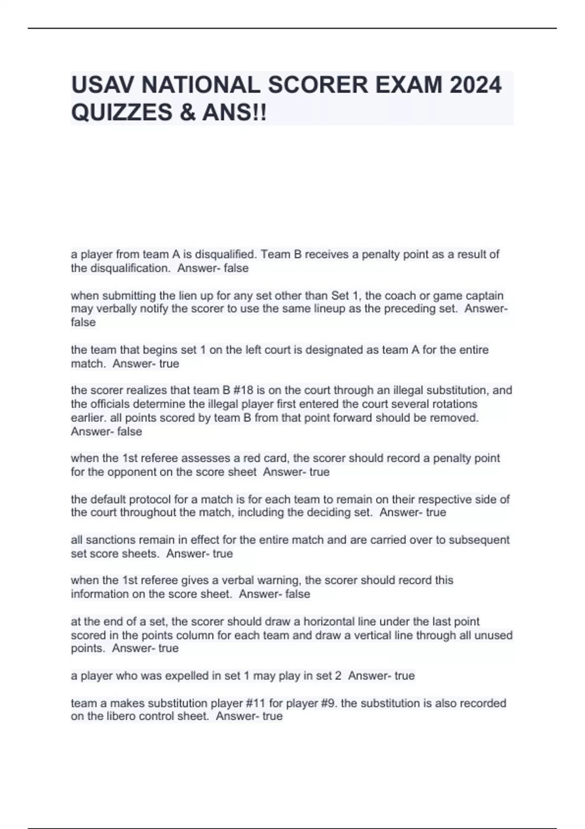 USAV NATIONAL SCORER EXAM 2024 QUIZZES & ANS!!
