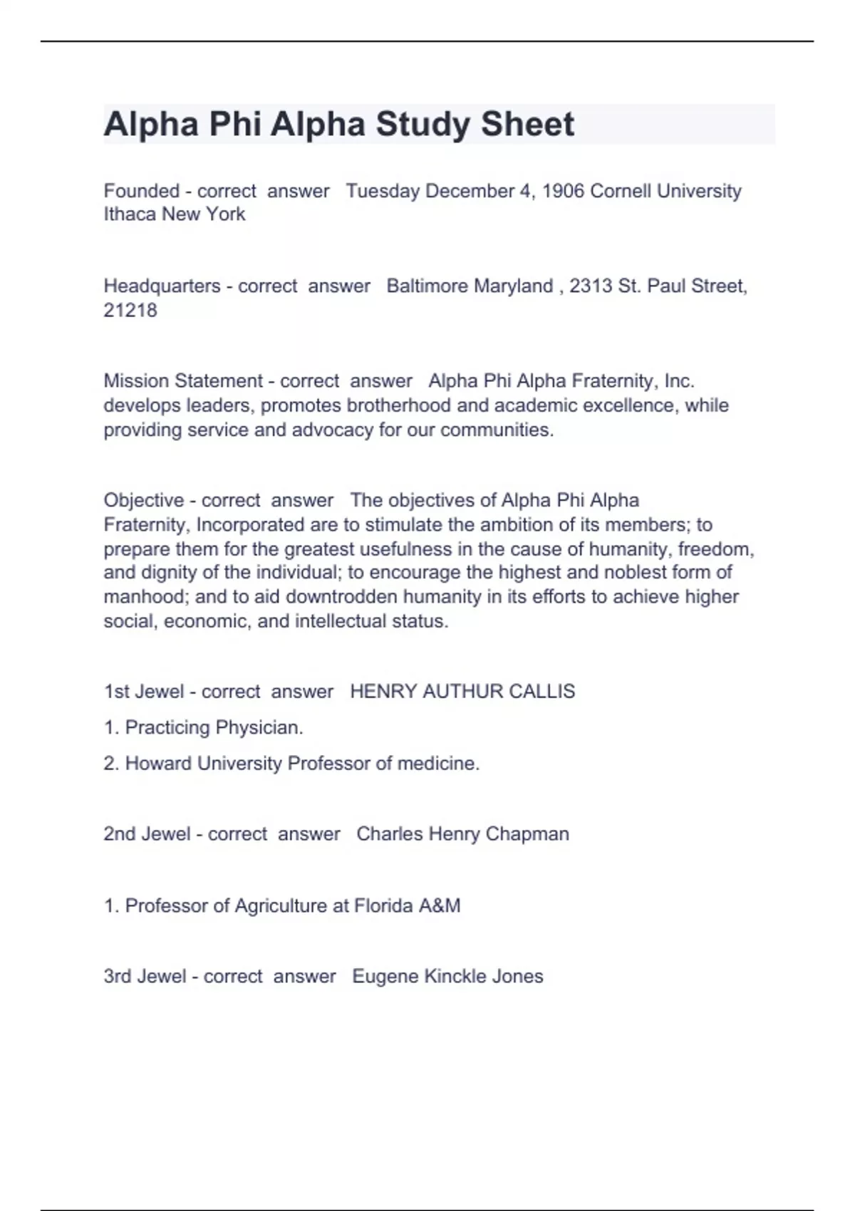 Alpha Phi Alpha Study Sheet Question and answers correctly solved 2024Founded - correct answer Tuesday December 4, 1906 Cornell University Ithaca New York Headquarters - correct answer Baltimore Maryland , 2313 St. Paul Street, 21218 Mission Statement - correct answer Alpha Phi Alpha Fraternity, Inc. develops leaders, promotes brotherhood and academic excellence, while providing service and advocacy for our communities. Objective - correct answer The objectives of Alpha Phi Alpha Fraternity, Incorporated are to stimulate the ambition of its members; to prepare them for the greatest usefulness in the cause of humanity, freedom, and dignity of the individual; to encourage the highest and noblest form of manhood; and to aid downtrodden humanity in its efforts to achieve higher social, economic, and intellectual status. 1st Jewel - correct answer HENRY AUTHUR CALLIS 1. Practicing Physician. 2. Howard University Pro