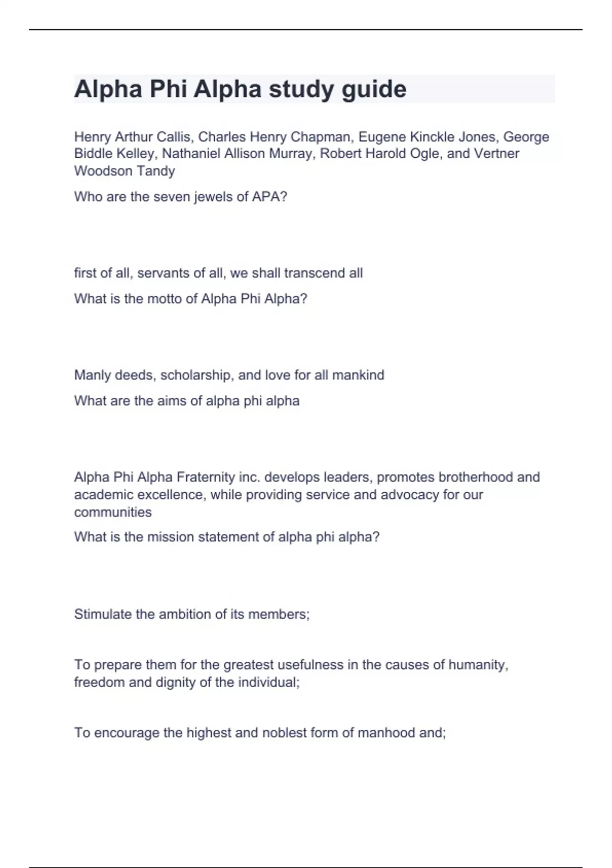 Alpha Phi Alpha study guide Questions with complete solution 2024Henry Arthur Callis, Charles Henry Chapman, Eugene Kinckle Jones, George Biddle Kelley, Nathaniel Allison Murray, Robert Harold Ogle, and Vertner Woodson Tandy Who are the seven jewels of APA? first of all, servants of all, we shall transcend all What is the motto of Alpha Phi Alpha? Manly deeds, scholarship, and love for all mankind What are the aims of alpha phi alpha Alpha Phi Alpha Fraternity inc. develops leaders, promotes brotherhood and academic excellence, while providing service and advocacy for our communities What is the mission statement of alpha phi alpha?