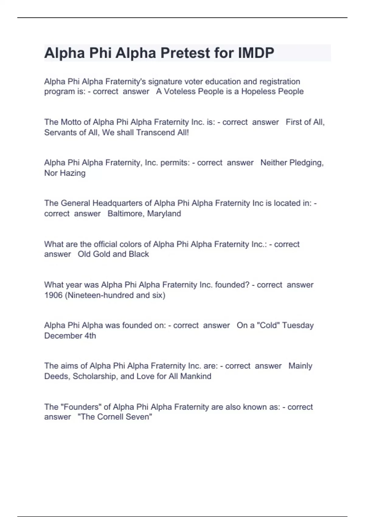 Alpha Phi Alpha Pretest for IMDP Question and answers 2024 verified to passAlpha Phi Alpha Fraternity's signature voter education and registration program is: - correct answer A Voteless People is a Hopeless People The Motto of Alpha Phi Alpha Fraternity Inc. is: - correct answer First of All, Servants of All, We shall Transcend All! Alpha Phi Alpha Fraternity, Inc. permits: - correct answer Neither Pledging, Nor Hazing The General Headquarters of Alpha Phi Alpha Fraternity Inc is located in: - correct answer Baltimore, Maryland What are the official colors of Alpha Phi Alpha Fraternity Inc.: - correct answer Old Gold and Black What year was Alpha Phi Alpha Fraternity Inc. founded? - correct answer 1906 (Nineteen-hundred and six) Alpha Phi Alpha was founded on: - correct answer On a "Cold" Tuesday December 4th