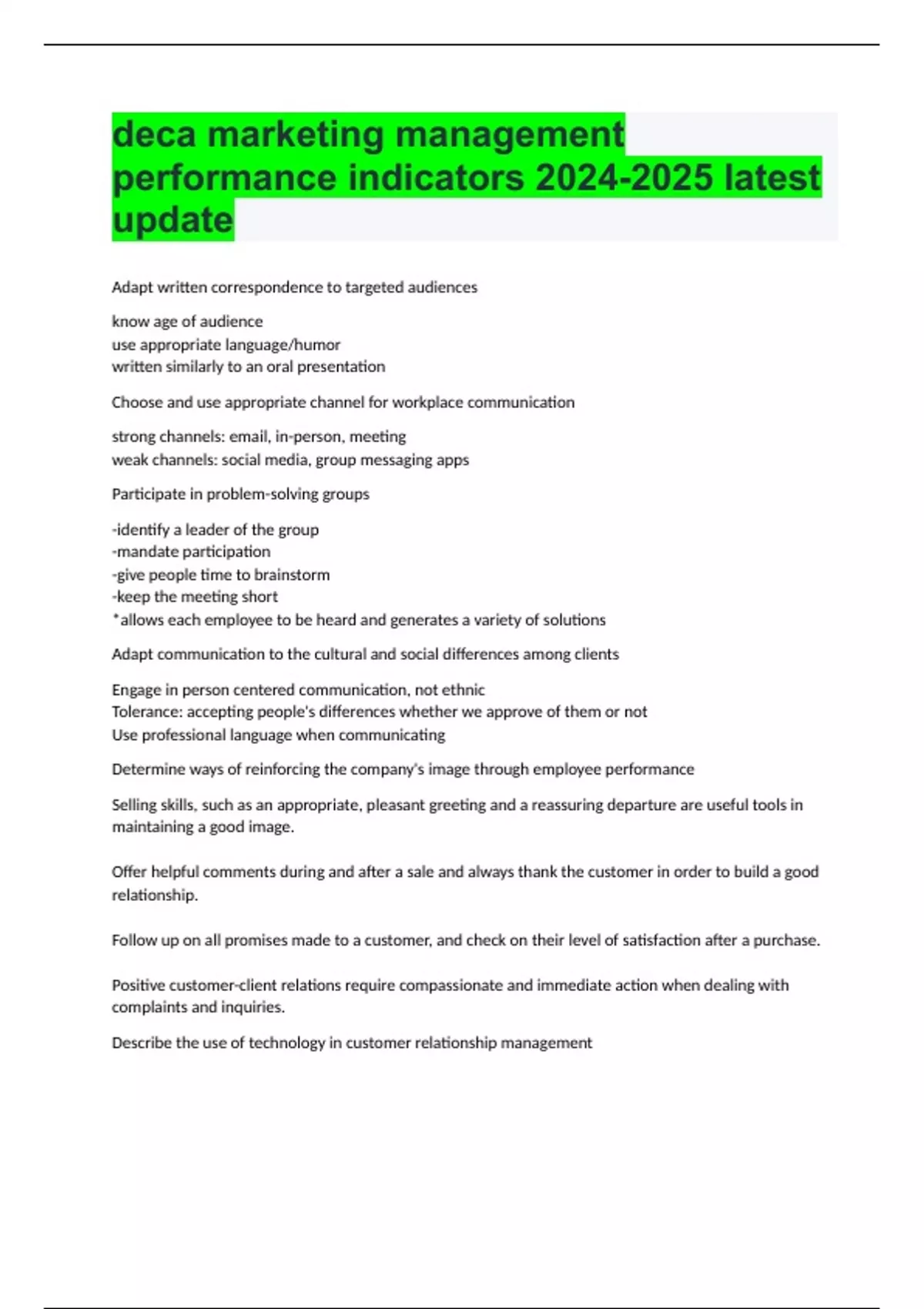 Adapt written correspondence to targeted audiences know age of audience use appropriate language/humor written similarly to an oral presentation Choose and use appropriate channel for workplace communication strong channels: email, in-person, meeting weak channels: social media, group messaging apps Participate in problem-solving groups -identify a leader of the group -mandate participation -give people time to brainstorm -keep the meeting short *allows each employee to be heard and generates a variety of solutions Adapt communication to the cultural and social differences among clients Engage in person centered communication, not ethnic Tolerance: accepting people's differences whether we approve of them or not Use professional language when communicating Determine ways of reinforcing the company's image through employee performance Selling skills, such as an appropriate, pleasant greeting and a reassuring departure are useful tools in maintaining a good image. Offer helpful comments during and after a sale and always thank the customer in order to build a good relationship. Follow up on all promises made to a customer, and check on their level of satisfaction after a purchase. Positive customer-client relations require compassionate and immediate action when dealing with complaints and inquiries. Describe the use of technology in customer relationship management businesses can compile all customer data across different channels (i.e. email, telephone, direct mail, live stream) Sales leads can be tracked enabling companies to put all of their leads in one place Identify ways that technology impacts businesses enables business owners to create secure environments for maintaining sensitive business or consumer information helps businesses create flexible work environments, employees can easily collaborate allows companies to connect with a broader customer base through internet and social media