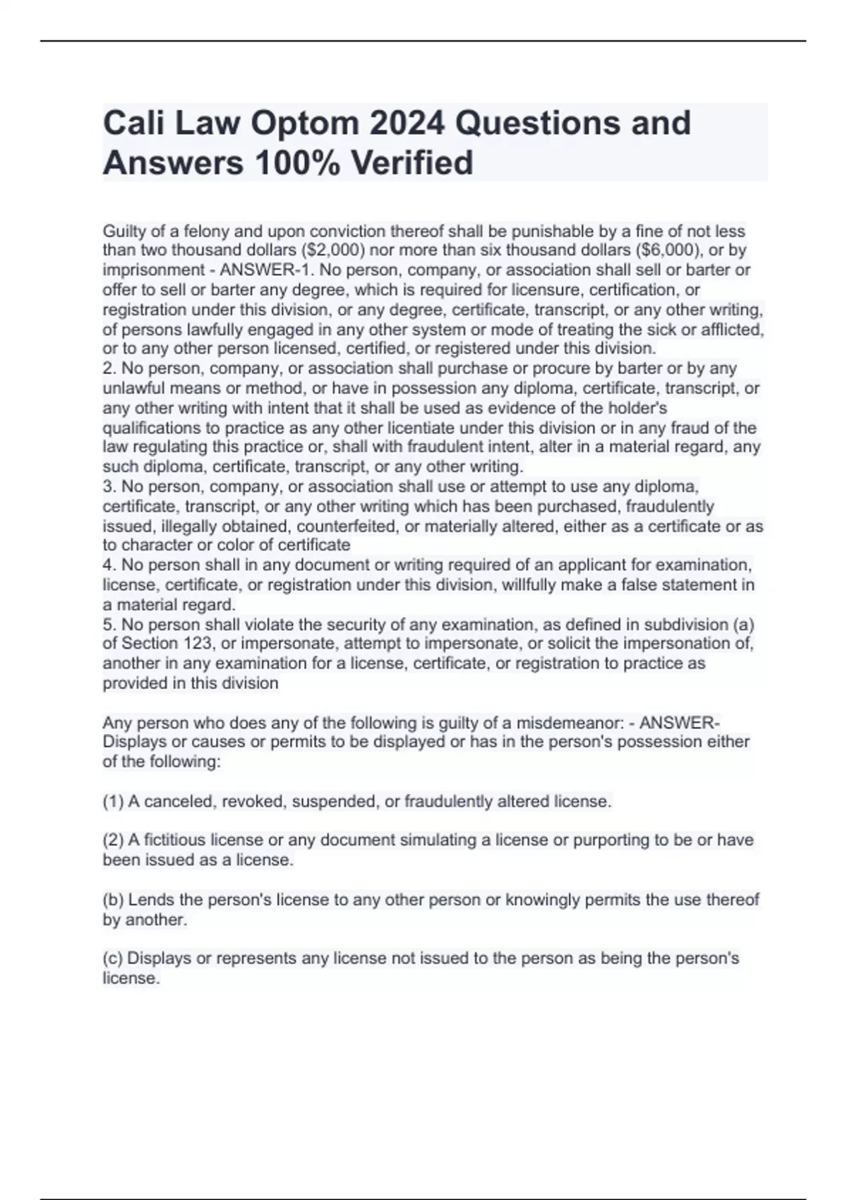 Cali Law Optom 2024 Questions and Answers 100% VerifiedCali Law Optom 2024 Questions and Answers 100% VerifiedCali Law Optom 2024 Questions and Answers 100% Verified Guilty of a felony and upon conviction thereof shall be punishable by a fine of not less than two thousand dollars ($2,000) nor more than six thousand dollars ($6,000), or by imprisonment