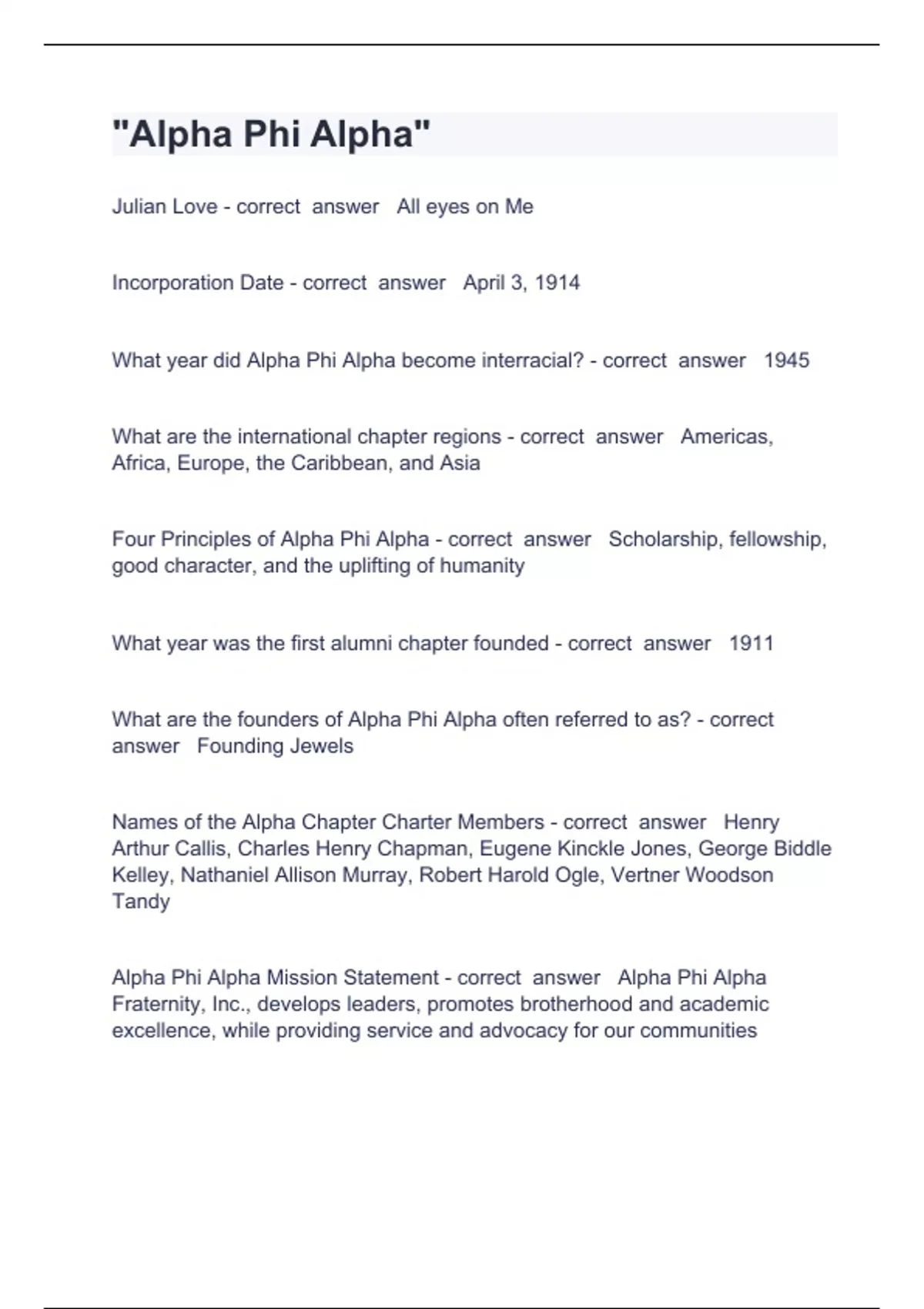 Alpha Phi Alpha Question and answers rated A+ 2024 Julian Love - correct answer All eyes on Me Incorporation Date - correct answer April 3, 1914 What year did Alpha Phi Alpha become interracial? - correct answer 1945 What are the international chapter regions - correct answer Americas, Africa, Europe, the Caribbean, and Asia Four Principles of Alpha Phi Alpha - correct answer Scholarship, fellowship, good character, and the uplifting of humanity What year was the first alumni chapter founded - correct answer 1911 What are the founders of Alpha Phi Alpha often referred to as? - correct answer Founding Jewels Names of the Alpha Chapter Charter Members - correct answer Henry Arthur Callis, Charles Henry Chapman, Eugene Kinckle Jones, George Biddle Kelley, Nathaniel Allison Murray, Robert Harold Ogle, Vertner Woodson Tandy Alpha Phi Alpha Mission Statement - correct answer Alpha Phi Alpha Fraternity, Inc., develops leaders, promotes brotherhood and academic excellence, while provid
