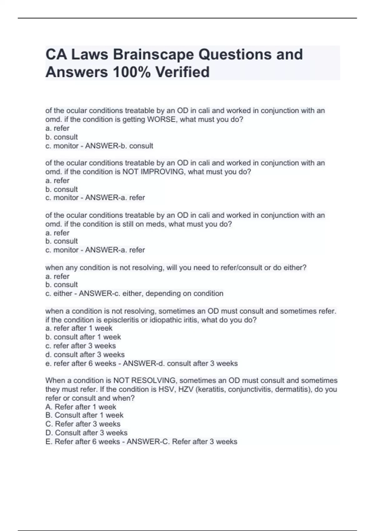 CA Laws Brainscape Questions and AnCA Laws Brainscape Questions and Answers 100% VerifiedCA Laws Brainscape Questions and Answers 100% VerifiedCA Laws Brainscape Questions and Answers 100% Verifiedswers 100% Verified of the ocular conditions treatable by an OD in cali and worked in conjunction with an omd. if the condition is getting WORSE, what must you do? a. refer b. consult c. monitor - ANSWER-b. consult of the ocular conditions treatable by an OD in cali and worked in conjunction with an omd. if the condition is NOT IMPROVING, what must you do? a. refer b. consult c. monitor - ANSWER-a. refer of the ocular conditions treatable by an OD in cali and worked in conjunction with an omd. if the condition is still on meds, what must you do? a. refer