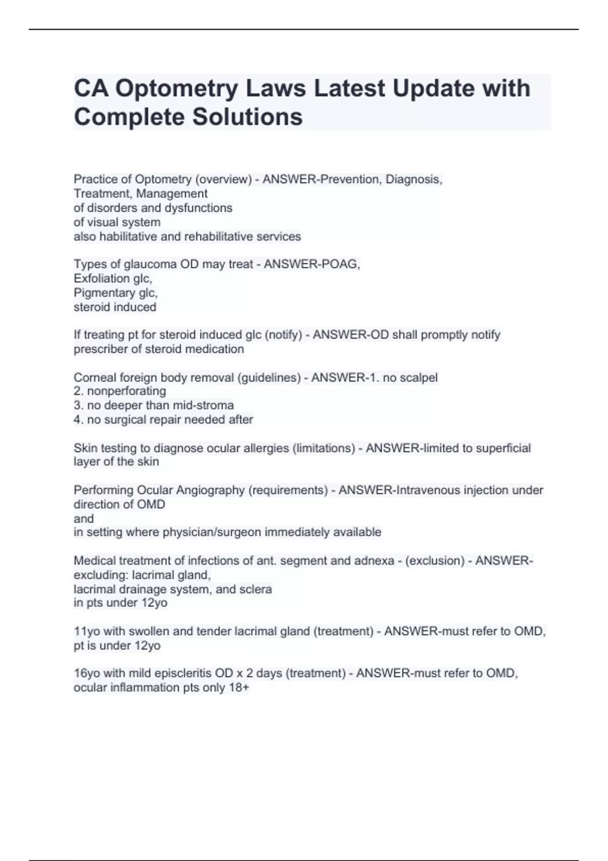 CA Optometry Laws Latest Update with Complete Solutions CA Optometry Laws Latest Update with Complete Solutions CA Optometry Laws Latest Update with Complete Solutions Practice of Optometry (overview) - ANSWER-Prevention, Diagnosis, Treatment, Management of disorders and dysfunctions of visual system also habilitative and rehabilitative services Types of glaucoma OD may treat - ANSWER-POAG, Exfoliation glc, Pigmentary glc, steroid induced If treating pt for steroid induced glc (notify) - ANSWER-OD shall promptly notify prescriber of steroid medication Corneal foreign body removal (guidelines) - ANSWER-1. no scalpel 2. nonperforating