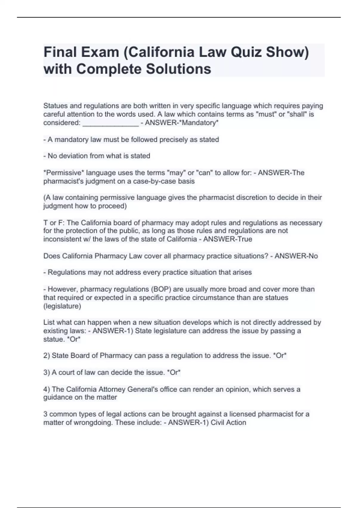 Final Exam (California Law Quiz Show) with Complete SolutionsFinal Exam (California Law Quiz Show) with Complete SolutionsFinal Exam (California Law Quiz Show) with Complete Solutions Statues and regulations are both written in very specific language which requires paying careful attention to the words used. A law which contains terms as "must" or "shall" is considered: ______________ - ANSWER-*Mandatory* - A mandatory law must be followed precisely as stated - No deviation from what is stated *Permissive* language uses the terms "may" or "can" to allow for: - ANSWER-The pharmacist's judgment on a case-by-case basis (A law containing permissive language gives the pharmacist discretion to decide in their judgment how to proceed)