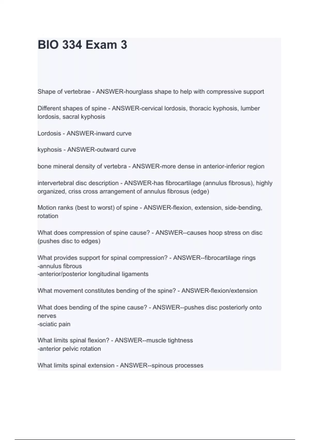 BIO 334 Exam 3 Shape of vertebrae - ANSWER-hourglass shape to help with compressive support Different shapes of spine - ANSWER-cervical lordosis, thoracic kyphosis, lumber lordosis, sacral kyphosis Lordosis - ANSWER-inward curve kyphosis - ANSWER-outward curve bone mineral dens