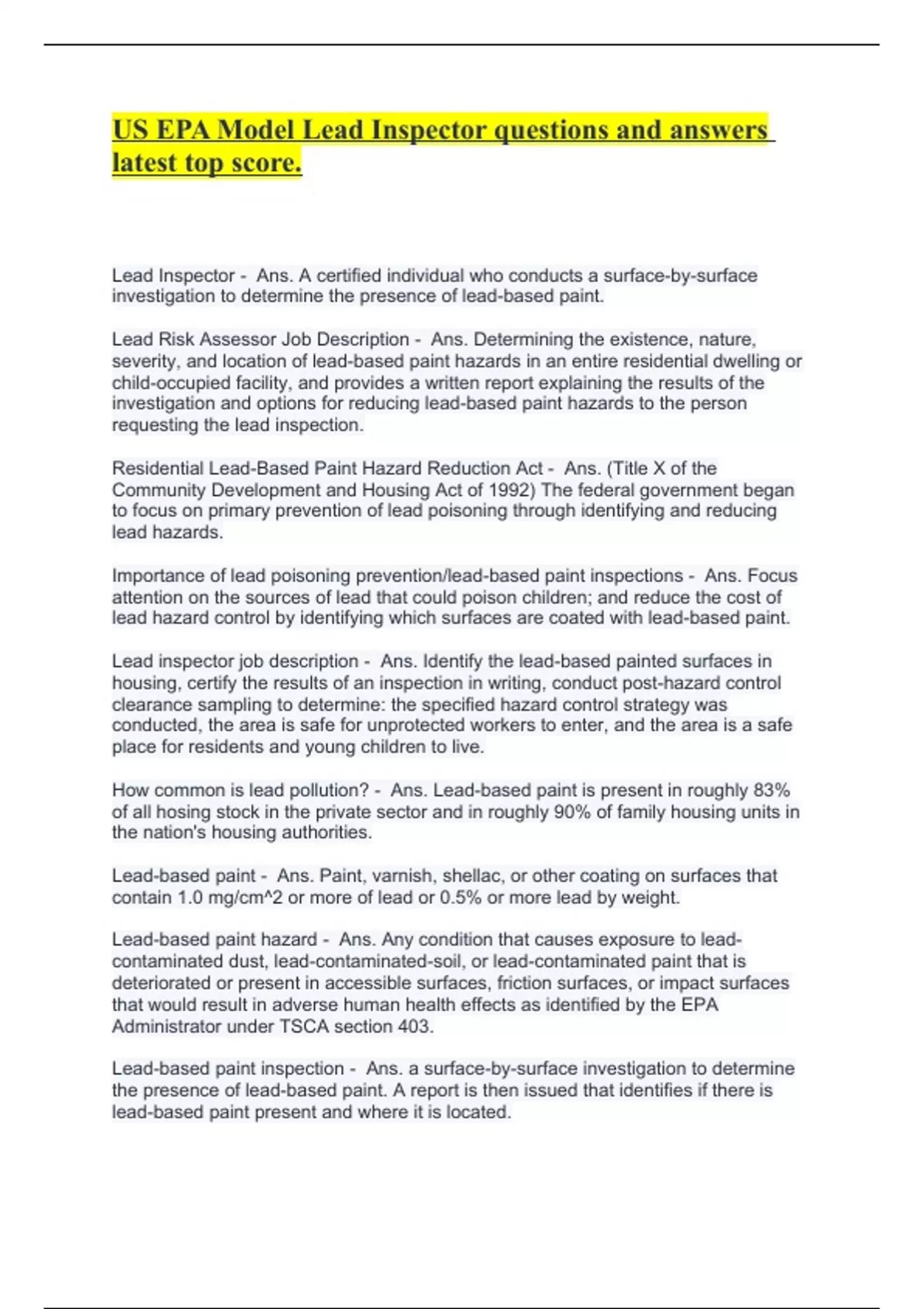 US EPA Model Lead Inspector questions and answers latest top score.