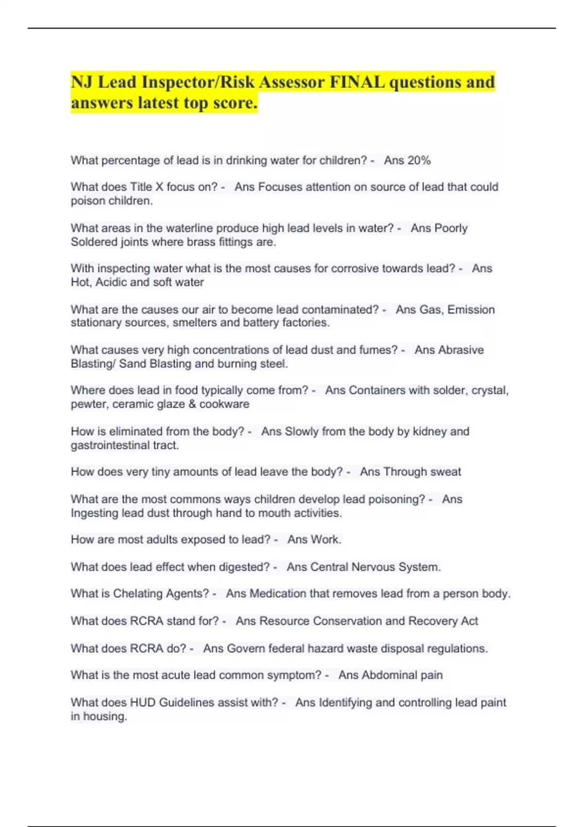 What percentage of lead is in drinking water for children? - Ans 20% What does Title X focus on? - Ans Focuses attention on source of lead that could poison children. What areas in the waterline produce high lead levels in water? - Ans Poorly Soldered joints where brass fittings are. With inspecting water what is the most causes for corrosive towards lead? - Ans Hot, Acidic and soft water What are the causes our air to become lead contaminated? - Ans Gas, Emission stationary sources, smelters and battery factories. What causes very high concentrations of lead dust and fumes? - Ans Abrasive Blasting/ Sand Blasting and burning steel. Where does lead in food typically come from? - Ans Containers with solder, crystal, pewter, ceramic glaze & cookware How is eliminated from the body? - Ans Slowly from the body by kidney and gastrointestinal tract. How does very tiny amounts of lead leave the body? - Ans Through sweat What are the most commons ways children develop lead poisoning? - Ans Ingesting lead dust through hand to mouth activities. How are most adults exposed to lead? - Ans Work. What does lead effect when digested? - Ans Central Nervous System. What is Chelating Agents? - Ans Medication that removes lead from a person body. What does RCRA stand for? - Ans Resource Conservation and Recovery Act What does RCRA do? - Ans Govern federal hazard waste disposal regulations. What is the most acute lead common symptom? - Ans Abdominal pain What does HUD Guidelines assist with? - Ans Identifying and controlling lead paint in housing. What needs to be done for HUD buildings built before 1978? - Ans All painted surfaces must be inspected to determine if testing is needed. How does occurrence coverage policy's work? - Ans They can still be active after policy. How does claims made coverage work? - Ans This is only covered during the policy period. Lead abatement should be conducted by who? - Ans Certified supervisors and trained workers Who set forth to eliminate lead exposure at work? - Ans NIOSH What are the elements of radiation safety? - Ans Duration, Shielding & distance. What does encapsulation relies on? - Ans adhesive to the substrate. When should encapsulation not be used? - Ans impact and friction areas. What materials do you use for encapsulation? - Ans Apoxy based plyable materials. Why should an inspector be on site when encapsulation is being used? - Ans This ensures they didn't dilute/apply correct. Enclosures must be what? - Ans Mechanically fastened to the substrate. Please solve for square feet: Wipe sample 2'x2" - Ans 0.33