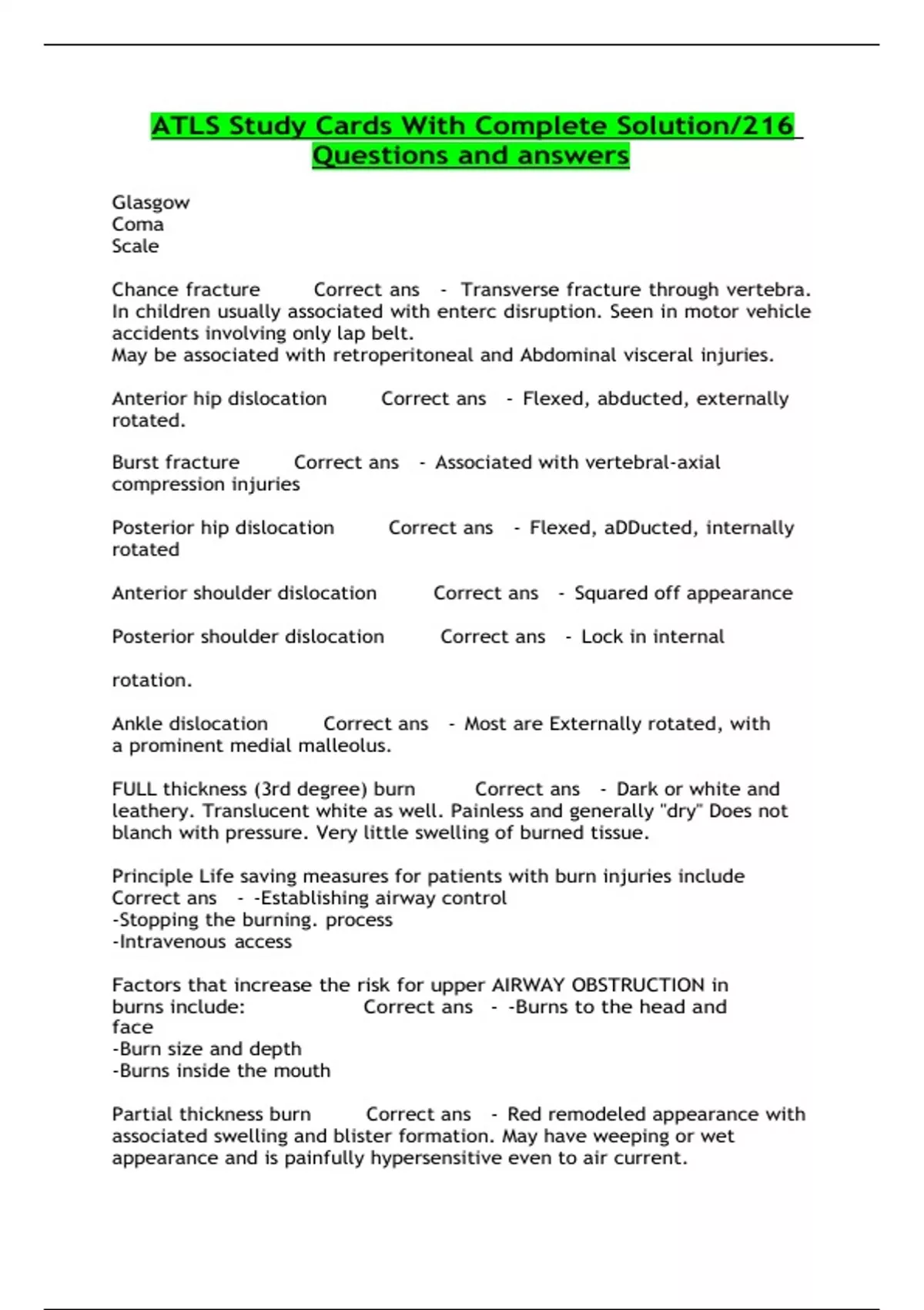 Glasgow Coma Scale Chance fracture Correct ans - Transverse fracture through vertebra. In children usually associated with enterc disruption. Seen in motor vehicle accidents involving only lap belt. May be associated with retroperitoneal and Abdominal visceral injuries. Anterior hip dislocation Correct ans - Flexed, abducted, externally rotated. Burst fracture Correct ans - Associated with vertebral-axial compression injuries Posterior hip dislocation Correct ans - Flexed, aDDucted, internally rotated Anterior shoulder dislocation Correct ans - Squared off appearance Posterior shoulder dislocation Correct ans - Lock in internal rotation. Ankle dislocation Correct ans - Most are Externally rotated, with a prominent medial malleolus. FULL thickness (3rd degree) burn Correct ans - Dark or white and leathery. Translucent white as well. Painless and generally "dry" Does not blanch with pressure. Very little swelling of burned tissue. Principle Life saving measures for patients with burn injuries include Correct ans - -Establishing airway control -Stopping the burning. process -Intravenous access Factors that increase the risk for upper AIRWAY OBSTRUCTION in burns include: Correct ans - -Burns to the head and face -Burn size and depth -Burns inside the mouth Partial thickness burn Correct ans - Red remodeled appearance with associated swelling and blister formation. May have weeping or wet appearance and is painfully hypersensitive even to air current. Signs and symptoms and history that suggest INHALATION INJURY include: Correct ans - These patients should be intubated. Inhalation injury is an indication for transfer to a burn center. Rule of nines - adult Correct ans - The palm represents 1% of the body total surface area. Symptoms of carbon monoxide poisoning and respective levels Correct ans - PaO2 does not reliably predict carbon monoxide poisoning because a CO partial pressure of only 1 mmm Hg results in a hemoglobin CO level of 40% or greater. Carbon monoxide has how many times greater affinity for hemoglobin than oxygen Correct ans - 240 times. It displaces the oxyhemoglobin desaturated curve to the LEFT. Two criteria required for the diagnosis of smoke inhalation injury Correct ans - -Exposure to a combustible agent -Signs of exposure to smoke in the lower airway, below the vocal cords, by bronchoscopy. Performing this action will help reduce neck and chest wall edema in patients with burn and inhalation injury. Correct ans - Elevation of the head and chest by 30 degrees. IV fluid administration formula for burn victims Correct ans - Indicated in burns involving over 20% of the body surface area. *(2-4 mL/kg of LR/NS) (weight in kg) (% area of burn); give 1/2 of this volume in first 8 hours. Remainder in over 16 hours. Large caliber, at least 15 gauge intravenous line should be introduced. Pitfalls for IV fluid requirements for burn victims. Correct ans - These patients require greater fluid requirements: ~immolation injury ~pediatric burn victims ~concomitant blunt or crush injuries.