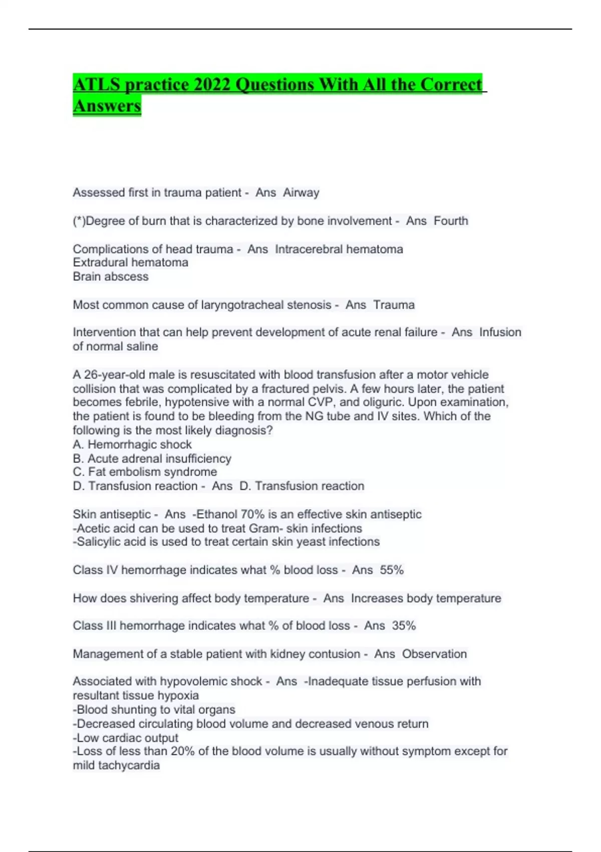 Assessed first in trauma patient - Ans Airway (*)Degree of burn that is characterized by bone involvement - Ans Fourth Complications of head trauma - Ans Intracerebral hematoma Extradural hematoma Brain abscess Most common cause of laryngotracheal stenosis - Ans Trauma Intervention that can help prevent development of acute renal failure - Ans Infusion of normal saline A 26-year-old male is resuscitated with blood transfusion after a motor vehicle collision that was complicated by a fractured pelvis. A few hours later, the patient becomes febrile, hypotensive with a normal CVP, and oliguric. Upon examination, the patient is found to be bleeding from the NG tube and IV sites. Which of the following is the most likely diagnosis? A. Hemorrhagic shock B. Acute adrenal insufficiency C. Fat embolism syndrome D. Transfusion reaction - Ans D. Transfusion reaction Skin antiseptic - Ans -Ethanol 70% is an effective skin antiseptic -Acetic acid can be used to treat Gram- skin infections -Salicylic acid is used to treat certain skin yeast infections Class IV hemorrhage indicates what % blood loss - Ans 55% How does shivering affect body temperature - Ans Increases body temperature Class III hemorrhage indicates what % of blood loss - Ans 35% Management of a stable patient with kidney contusion - Ans Observation Associated with hypovolemic shock - Ans -Inadequate tissue perfusion with resultant tissue hypoxia -Blood shunting to vital organs -Decreased circulating blood volume and decreased venous return -Low cardiac output -Loss of less than 20% of the blood volume is usually without symptom except for mild tachycardia -Patients become orthostatic with losses between 20 and 40% -Shock is evidenced by tachycardia, hypotension, oliguria, flat neck veins The most effective method of monitoring the success of resuscitation during CPR? - Ans Reactivity of pupils to light Used to ensure correct placement of endotracheal tube - Ans -Ultrasound -Bilateral breath sounds -Sustained end-tidal CO2 Total body surface area involved in a burn in an adult to the anterior chest and abdomen - Ans 18% What is often caused by carotid massage? - Ans Bradycardia Step in a patient diagnosed with tension pneumothorax - Ans 1. Needle decompression/ thoracotomy 2. Chest tube True statements regarding diaphragmatic injuries - Ans -Blunt diaphragmatic injuries are usually associated with skeletal trauma -Penetrating diaphragmatic injuries may be missed -Repair of traumatic diaphragmatic injuries usually does not require prosthetic material First priority in the treatment of an unconscious patient - Ans Checking the pulse A patient involved in a road accident is brought to the emergency department in an unconscious state. On arrival, her vitals show a temperature of 96.4 degrees Fahrenheit, a respiration rate of 24 breaths per minute, a heart rate of 140 beats per minute, and a blood pressure of 80/40 mm Hg. She is cold, shivering, and perspiring profusely. She has bilateral reactive pupils but she does not respond to pain. On physical examination, she has no obvious sign of external bleeding. Which of the following cannot be the cause of hypotension in this patient? A. Pelvic fracture B. Fracture of femur C. Intracranial hemorrhage D. Hemothorax - Ans C. Intracranial hemorrhage A patient suffered a slash to his right neck. The wound is over the mid-portion of the sternocleidomastoid. There is a large hematoma and brisk bleeding when uncovered. He is stable. What is the next step in management? A. Get an angiogram B. Close the wound in the ER C. Take him to the operating room D. CT scan to evaluate neck structure - Ans C. Take him to the OR After abdominal injury, which of the following urinalysis findings would be an indication for further testing? A. 0-5 casts/HPF B. 5-10 WBC/HPF C. 10-20 RBC/HPF D. Gross hematuria - Ans D. Gross hematuria A laceration of the neck superficial to the deep cervical fascia along the sternocleidomastoid muscle at its midpoint would cause bleeding from which structure? - Ans External jugular vein Clinical features associated with tension pneumothorax - Ans Unilateral decrease in breath sounds Hyperresonance Respiratory distress Tachycardia Tracheal shift Desatruation Decreased breath sounds Decreased compliance Asymmetric chest movement NOT hypertension, audible bronchial sounds Not recommended as a mode of ventilation for a patient with a diaphragmatic hernia A. Bag and mask B. LMA C. Endotracheal intubation D. Jet ventilation - Ans A. Bag and mask What is the next step in the assessment of a traumatic patient after airway is established? - Ans Breathing Blood group that is considered a universal donor -