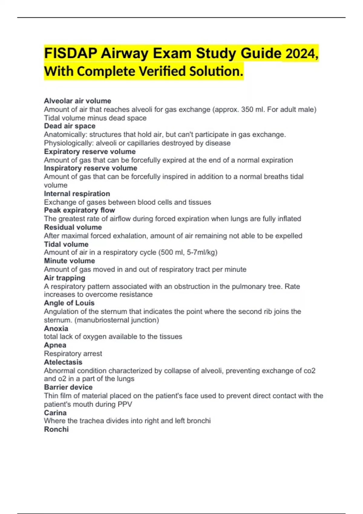 FISDAP Airway Exam Study Guide 2024, With Complete Verified Solution. Alveolar air volume Amount of air that reaches alveoli for gas exchange (approx. 350 ml. For adult male) Tidal volume minus dead space Dead air space Anatomically: structures that hold air, but can't participate in gas exchange. Physiologically: alveoli or capillaries destroyed by disease Expiratory reserve volume Amount of gas that can be forcefully expired at the end of a normal expiration Inspiratory reserve volume Amount of gas that can be forcefully inspired in addition to a normal breaths tidal volume Internal respiration Exchange of gases between blood cells and tissues Peak expiratory flow The greatest rate of airflow during forced expiration when lungs are fully inflated Residual volume After maximal forced exhalation, amount of air remaining not able to be expelled Tidal volume Amount of air in a respiratory cycle (500 ml, 5-7ml/kg) Minute volume Amount of gas moved in and out of respiratory tract