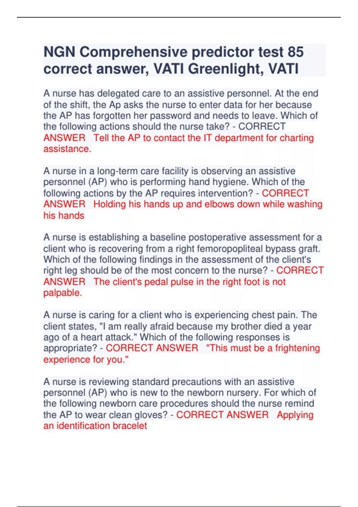 NGN Comprehensive predictor test 85 correct answer, VATI Greenlight, VATI A nurse has delegated care to an assistive personnel. At the end of the shift, the Ap asks the nurse to enter data for her because the AP has forgotten her password and needs to leave. Which of the following actions should the nurse take? - CORRECT ANSWER Tell the AP to contact the IT department for charting assistance. A nurse in a long-term care facility is observing an assistive personnel (AP) who is performing hand hygiene. Which of the following actions by the AP requires intervention? - CORRECT ANSWER Holding his hands up and elbows down while washing his hands A nurse is establishing a baseline postoperative assessment for a client who is recovering from a right femoropopliteal bypass graft. Which of the following findings in the assessment of the client's right leg should be of the most concern to the nurse? - CORRECT ANSWER The client's pedal pulse in the right foot is not palpable. A nurse is caring for a client who is experiencing chest pain. The client states, "I am really afraid because my brother died a year ago of a heart attack." Which of the following responses is appropriate? - CORRECT ANSWER "This must be a frightening experience for you." A nurse is reviewing standard precautions with an assistive personnel (AP) who is new to the newborn nursery. For which of the following newborn care procedures should the nurse remind the AP to wear clean gloves? - CORRECT ANSWER Applying an identification bracelet A nurse is collecting data from a client who is 1 day postoperative following a total hip arthroplasty and has deep-vein thrombosis. Which of the following findings should the nurse expect in the affected extremity? - CORRECT ANSWER Dull, aching pain A nurse is contributing to the plan of care for a client who has bipolar disorder and is experiencing mania. Which of the following actions should the nurse include in the plan of care? - CORRECT ANSWER Decrease the level of environmental stimuli. A nurse is caring for a client who is receiving morphine 2 mg subcutaneously every 4 hr for pain. The medication is available in a vial containing 10 mg/mL. How many ml should the nurse administer? (Round the answer to the nearest tenth. Use a leading zero if it applies. Do not use a trailing zero.) - CORRECT ANSWER 0.2 ML A nurse is caring for a client who is receiving prazosin. The client's blood pressure is 100/60 mm Hg. Which of the following actions should the nurse take? - CORRECT ANSWER Instruct the client to stand up slowly. A nurse is checking the home environment of a client for safety hazards. Which of the following items require intervention by the nurse? - CORRECT ANSWER The television set is turned to a loud volume. A nurse is reinforcing teaching with a client about the importance of a low-sodium diet. Which of the following foods should the nurse recommend as the best choice to include in a low-sodium diet? - CORRECT ANSWER 1 medium baked potato A nurse in a prenatal clinic is reinforcing teaching with a client about a nonstress test. Which of the following statements should