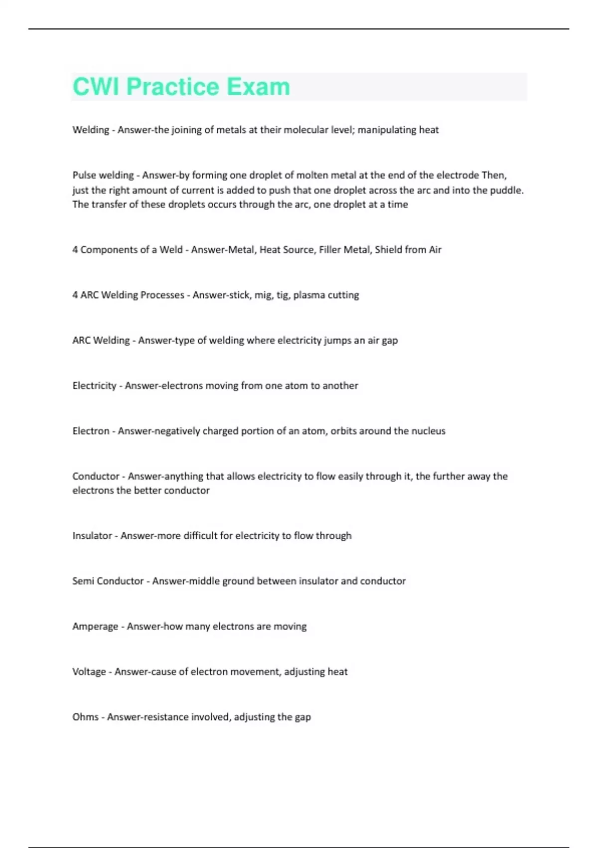 Welding - Answer-the joining of metals at their molecular level; manipulating heat Pulse welding - Answer-by forming one droplet of molten metal at the end of the electrode Then, just the right amount of current is added to push that one droplet across the arc and into the puddle. The transfer of these droplets occurs through the arc, one droplet at a time 4 Components of a Weld - Answer-Metal, Heat Source, Filler Metal, Shield from Air 4 ARC Welding Processes - Answer-stick, mig, tig, plasma cutting ARC Welding - Answer-type of welding where electricity jumps an air gap Electricity - Answer-electrons moving from one atom to another Electron - Answer-negatively charged portion of an atom, orbits around the nucleus Conductor - Answer-anything that allows electricity to flow easily through it, the further away the electrons the better conductor Insulator - Answer-more difficult for electricity to flow through Semi Conductor - Answer-middle ground between insulator and conductor Amperage - Answer-how many electrons are moving Voltage - Answer-cause of electron movement, adjusting heat Ohms - Answer-resistance involved, adjusting the gapWelding Hazards - Answer-Personal Protection, Fumes, ARC radiation, electrical shock, fire, burns, explosive gases Galvanized Metal - Answer-coated in zinc, dangerous to weld Electrode - Answer-a metal rod having approximately the same composition as the metal to be welded AC - Answer-Alternating current, back and forth, most common DC - Answer-direct current, can go either straight or reverse Purposes of Flux Coating - Answer-cleansing and deoxidizing agent, release an inert gas for protection from atmospheric oxides and nitrides, form slag over deposited metal to protect weld, easier starting, stabilizing the arc, reduced splatter, better penetration First 2 digits of Electrode - Answer-signify strength in thousands of pounds per square inch