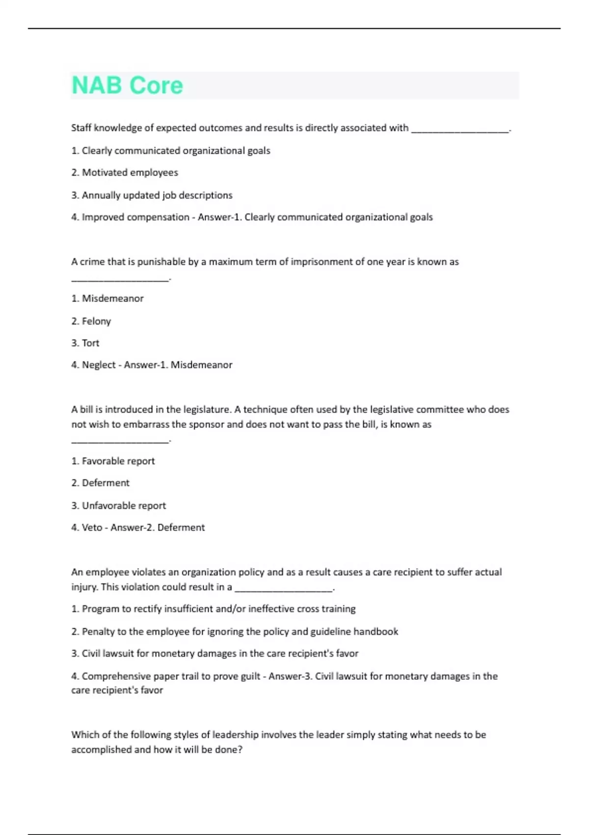Staff knowledge of expected outcomes and results is directly associated with __________________. 1. Clearly communicated organizational goals 2. Motivated employees 3. Annually updated job descriptions 4. Improved compensation - Answer-1. Clearly communicated organizational goals A crime that is punishable by a maximum term of imprisonment of one year is known as __________________. 1. Misdemeanor 2. Felony 3. Tort 4. Neglect - Answer-1. Misdemeanor A bill is introduced in the legislature. A technique often used by the legislative committee who does not wish to embarrass the sponsor and does not want to pass the bill, is known as __________________. 1. Favorable report 2. Deferment 3. Unfavorable report 4. Veto - Answer-2. Deferment An employee violates an organization policy and as a result causes a care recipient to suffer actual injury. This violation could result in a __________________. 1. Program to rectify insufficient and/or ineffective cross training 2. Penalty to the employee for ignoring the policy and guideline handbook 3. Civil lawsuit for monetary damages in the care recipient's favor 4. Comprehensive paper trail to prove guilt - Answer-3. Civil lawsuit for monetary damages in the care recipient's favor Which of the following styles of leadership involves the leader simply stating what needs to be accomplished and how it will be done?1. Laissez-faire 2. Democratic 3. Autocratic 4. Proactive - Answer-1. Laissez-faire Which of the following advance directives is commonly described as appointing someone to make decisions on a care recipient's behalf? 1. Do not resuscitate 2. Living will 3. Durable power of attorney 4. Plan of care - Answer-3. Durable power of attorney Team building is a key component of which management style? 1. Participatory 2. Authoritative 3. Delegative 4. Objective - Answer-1. Participatory Strategic planning is best defined as an organizational process for __________________. 1. Identifying goals and objectives 2. Implementing goals to create a desired outcome 3. Making decisions that achieve compliance 4. Comparing an organization's market position to its competition - Answer-1. Identifying goals and objectives The process of pricing, promoting, and distributing services that satisfy both individual and organizational objectives is known as __________________. 1. Market orientation 2. Marketing 3. Product specialization 4. Branding - Answer-2. Marketing