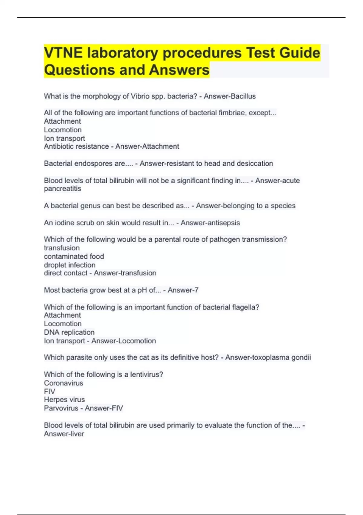 What is the morphology of Vibrio spp. bacteria? - Answer-Bacillus All of the following are important functions of bacterial fimbriae, except... Attachment Locomotion Ion transport Antibiotic resistance - Answer-Attachment Bacterial endospores are.... - Answer-resistant to head and desiccation Blood levels of total bilirubin will not be a significant finding in.... - Answer-acute pancreatitis A bacterial genus can best be described as... - Answer-belonging to a species An iodine scrub on skin would result in... - Answer-antisepsis Which of the following would be a parental route of pathogen transmission? transfusion contaminated food droplet infection direct contact - Answer-transfusion Most bacteria grow best at a pH of... - Answer-7 Which of the following is an important function of bacterial flagella? Attachment Locomotion DNA replication Ion transport - Answer-Locomotion Which parasite only uses the cat as its definitive host? - Answer-toxoplasma gondii Which of the following is a lentivirus? Coronavirus FIV Herpes virus Parvovirus - Answer-FIV Blood levels of total bilirubin are used primarily to evaluate the function of the.... - Answer-liver