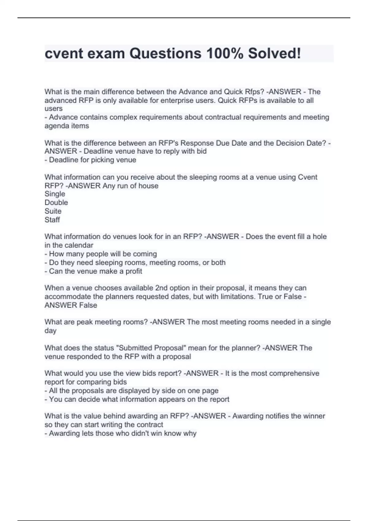 What is the main difference between the Advance and Quick Rfps? -ANSWER - The advanced RFP is only available for enterprise users. Quick RFPs is available to all users - Advance contains complex requirements about contractual requirements and meeting agenda items What is the difference between an RFP's Response Due Date and the Decision Date? -ANSWER - Deadline venue have to reply with bid - Deadline for picking venue What information can you receive about the sleeping rooms at a venue using Cvent RFP? -ANSWER Any run of house Single Double Suite Staff What information do venues look for in an RFP? -ANSWER - Does the event fill a hole in the calendar - How many people will be coming - Do they need sleeping rooms, meeting rooms, or both - Can the venue make a profit When a venue chooses available 2nd option in their proposal, it means they can accommodate the planners requested dates, but with limitations. True or False -ANSWER False What are peak meeting rooms? -ANSWER The most meeting rooms needed in a single day What does the status "Submitted Proposal" mean for the planner? -ANSWER The venue responded to the RFP with a proposal What would you use the view bids report? -ANSWER - It is the most comprehensive report for comparing bids - All the proposals are displayed by side on one page - You can decide what information appears on the report What is the value behind awarding an RFP? -ANSWER - Awarding notifies the winner so they can start writing the contract - Awarding lets those who didn't win know why What is the RFP response process called? -ANSWER - RFP management - Proposal wizard - Su