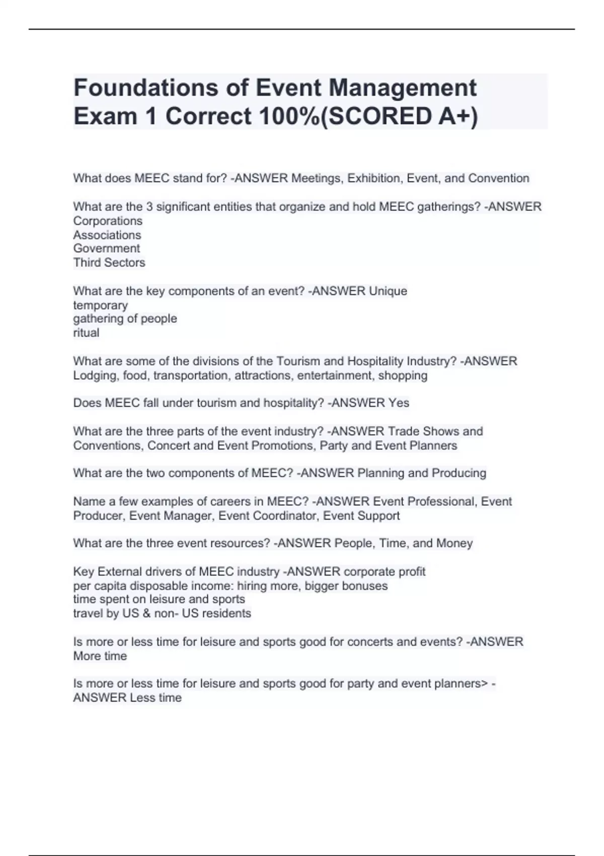 Foundations of Event Management Exam 1 Correct 100%(SCORED A+)