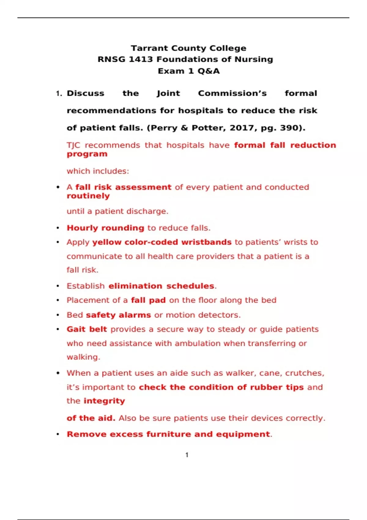 RNSG 1413 Foundations of Nursing Exam 1 Q&A 1. Discuss the Joint Commission’s formal recommendations for hospitals to reduce the risk of patient falls. (Perry & Potter, 2017, pg. 390). TJC recommends that hospitals have formal fall reduction program which includes: • A fall risk assessment of every patient and conducted routinely until a patient discharge. • Hourly rounding to reduce falls. • Apply yellow color-coded wristbands to patients’ wrists to communicate to all health care providers that a patient is a fall risk. • Establish elimination schedules. • Placement of a fall pad on the floor along the bed • Bed safety alarms or motion detectors. • Gait belt provides a secure way to steady or guide patients who need assistance with ambulation when transferring or walking. • When a patient uses an aide such as walker, cane, crutches, it’s important to check the condition of rubber tips and the integrity of the aid. Also be sure patients use their devices correctly. • Remove excess furniture and equipment. • make sure that patients wear rubber-soled shoes or slippers for walking or transferring.