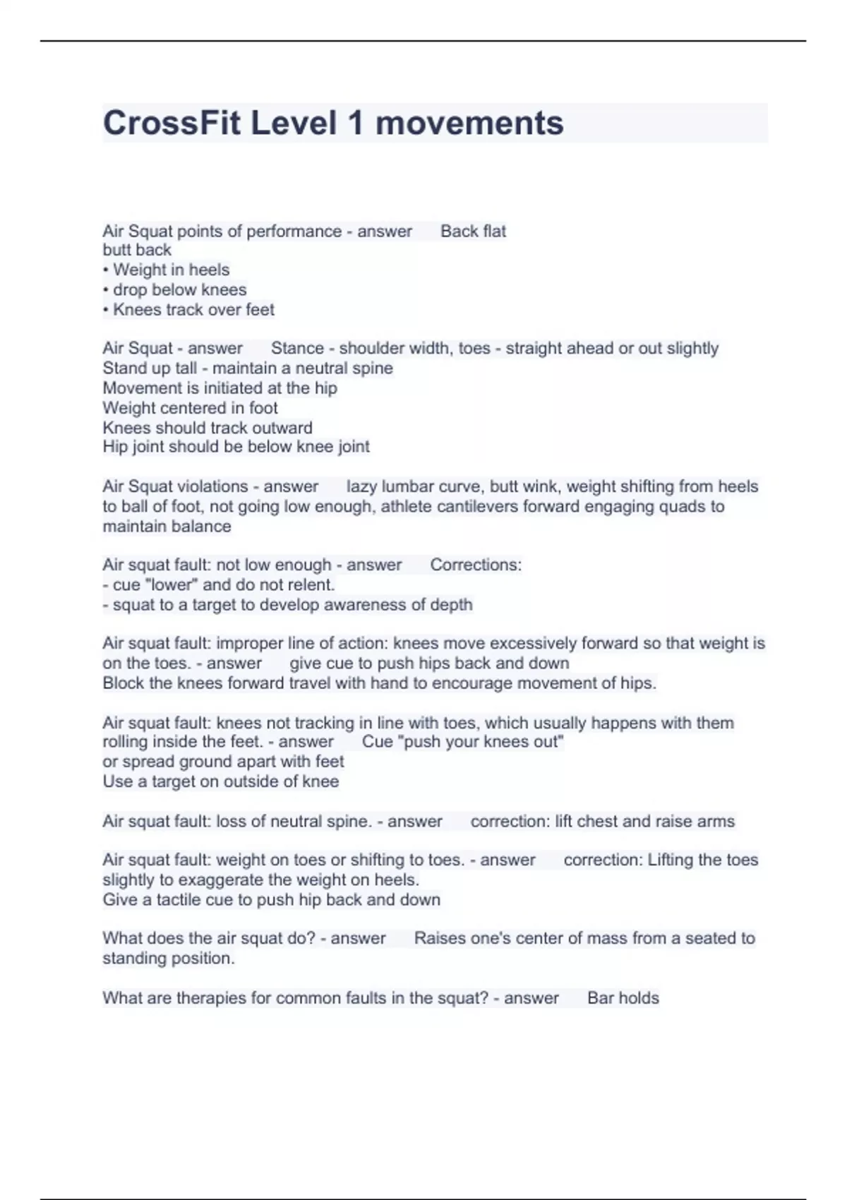 CrossFit Level 1 movements Questions and Answers Fully Solved