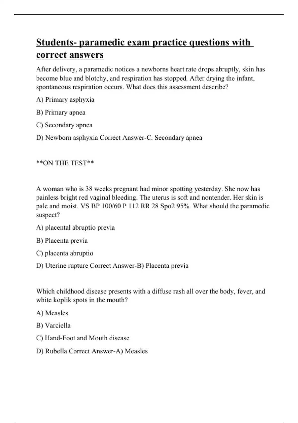 Students- paramedic exam practice questions with correct answers