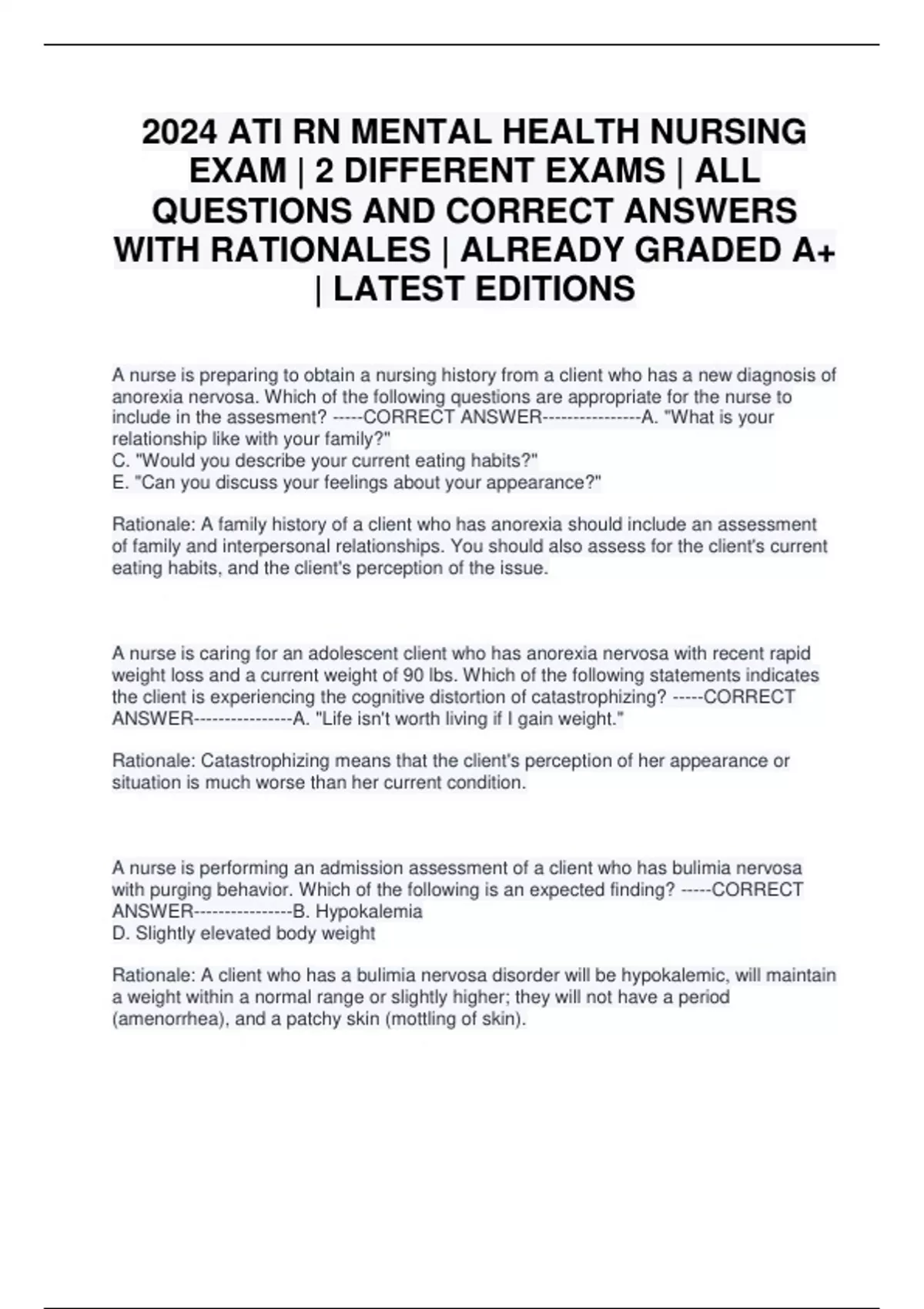 2024 ATI RN MENTAL HEALTH NURSING EXAM | 2 DIFFERENT EXAMS | ALL QUESTIONS AND CORRECT ANSWERS WITH RATIONALES | ALREADY GRADED A+ | LATEST EDITIONS