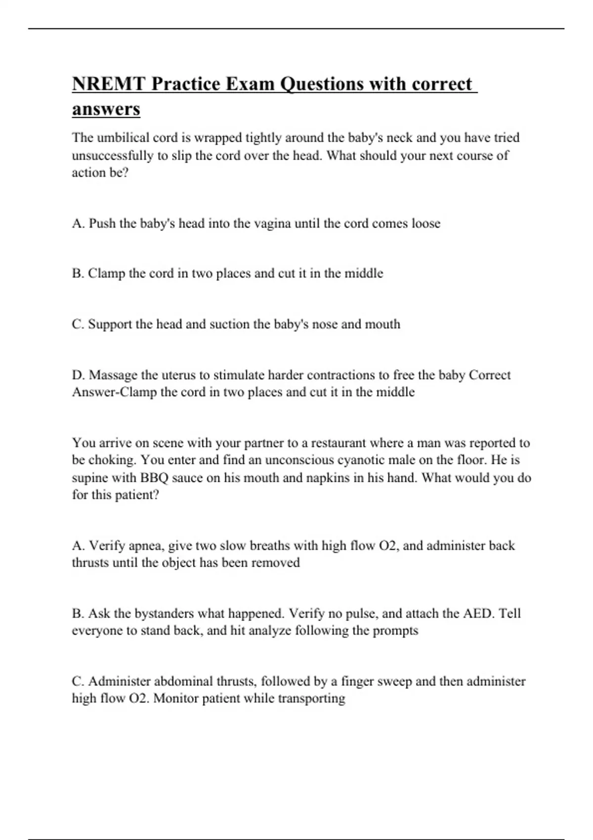 The umbilical cord is wrapped tightly around the baby's neck and you have tried unsuccessfully to slip the cord over the head. What should your next course of action be? A. Push the baby's head into the vagina until the cord comes loose B. Clamp the cord in two places and cut it in the middle C. Support the head and suction the baby's nose and mouth D. Massage the uterus to stimulate harder contractions to free the baby Correct Answer-Clamp the cord in two places and cut it in the middle You arrive on scene with your partner to a restaurant where a man was reported to be choking. You enter and find an unconscious cyanotic male on the floor. He is supine with BBQ sauce on his mouth and napkins in his hand. What would you do for this patient? A. Verify apnea, give two slow breaths with high flow O2, and administer back thrusts until the object has been removed B. Ask the bystanders what happened. Verify no pulse, and attach the AED. Tell everyone to stand back, and hit analyze