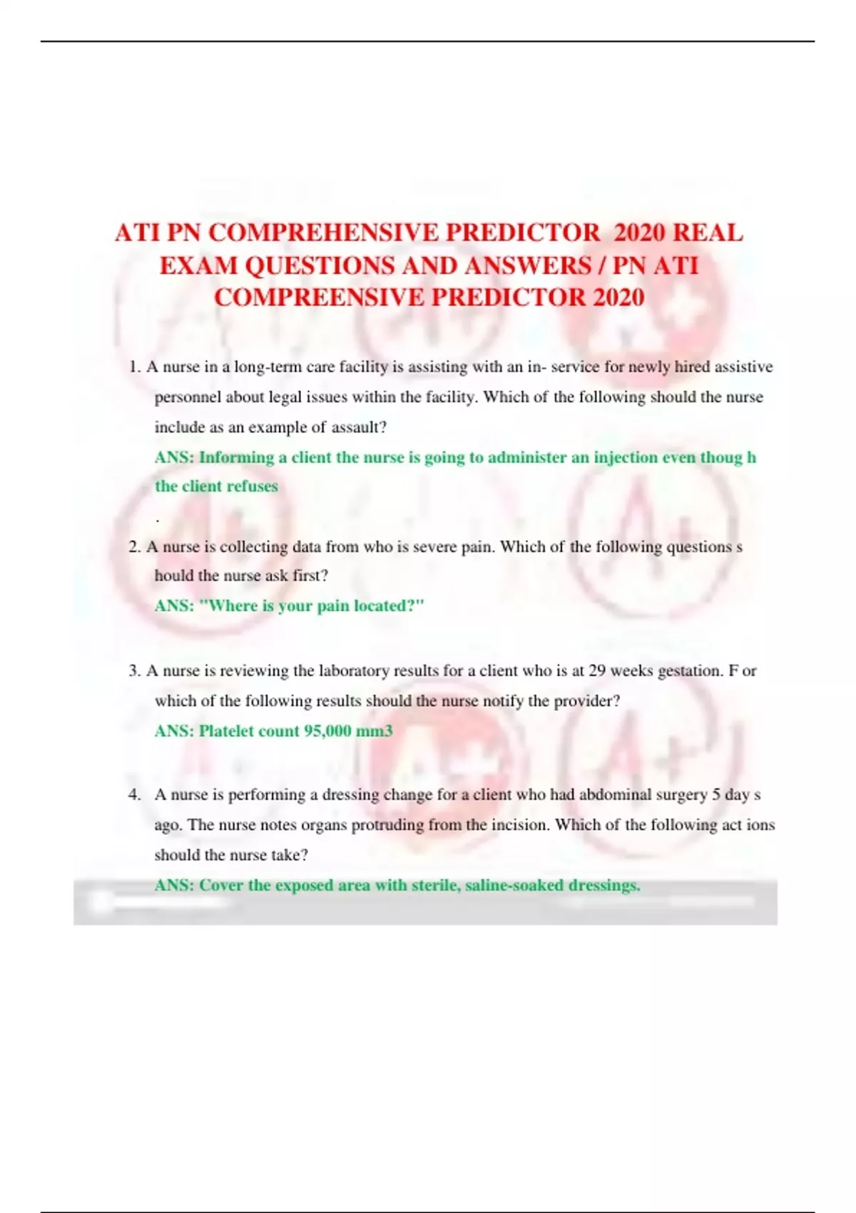 A nurse in a long-term care facility is assisting with an in- service for newly hired assistive personnel about legal issues within the facility. Which ofIthe following should the nurse include as an example ofIassault? ANS: Informing a client the nurse is going to administer an injection even thoug h the client refuses . 2. A nurse is collecting data from who is severe pain. Which ofIthe following questions s hould the nurse ask first? ANS: "Where is your pain located?" 3. A nurse is reviewing the laboratory results for a client who is at 29 weeks gestation. F or which of the following results should the nurse notify the provider? ANS: Platelet count 95,000 mm3 4. A nurse is performing a dressing change for a client who had abdominal surgery 5 day s ago. The nurse notes organs protruding from the incision. Which ofIthe following act ions should the nurse take? ANS: Cover the exposed area with sterile, saline-soaked dressings. 5. A nurse is speaking with the adult daughter ofIa client who has Alzheimer's disease. T he daughter states, "I love my dad, but caring for him is wearing me out." Which ofIth e following response should the nurse make? ANS: "Let's discuss how caring for your father is afollowingecting your health. 6. A nurse is contributing to the plan ofIcare for a care for a client who has chest tube co nnected to a closed drainage system. Which ofIthe following actions should the nurse i nclude in the plan of care? ANS: Maintain the drainage system below the level ofIthe client's chest. 7. A nurse in an acute mental health facility is caring for a client who has borderline pers onality disorder and reports. "I am going to kill my girlfriend when I get out ofIhere." Which ofIthe following actions should the nurse take? ANS: Notify the client's care team of the threats against the partner 8. A nurse is admitting a client who is at high risk for suicide. Which ofIthe following ac tions is the nurse's priority? ANS: Search the client's personal belongings 9. A nurse is caring for a client who is 1 day postoperative and is unable to ambulate. W hich ofIthe following actions should the nurse take to promote the client's venous retur n? ANS: Maintain the sequential compression device. 10. A nurse on an acute care unity is collecting data from a school- age Child who has cystic fibrosis. Which ofIthe following findings is the priority for th e nurse? ANS: Reports lack ofIappetite 11. a nurse working in a provider's ofollowingice receives a phone call from the parent ofI a school
