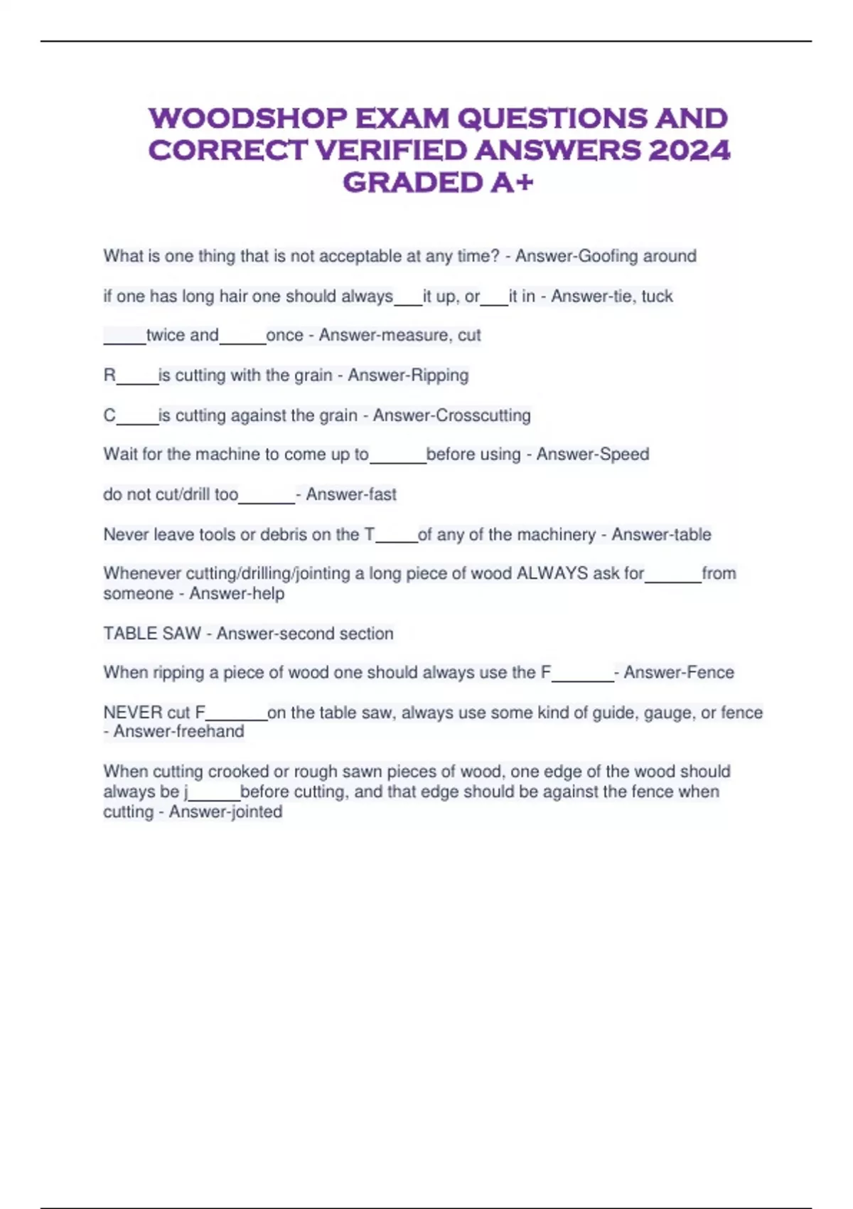 WOODSHOP EXAM QUESTIONS AND CORRECT VERIFIED ANSWERS 2024 GRADED A+