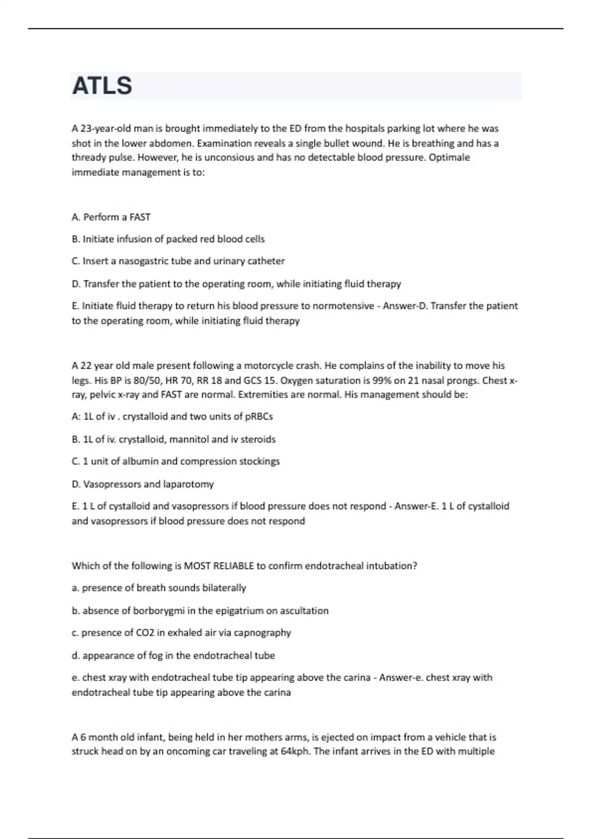 A 23-year-old man is brought immediately to the ED from the hospitals parking lot where he was shot in the lower abdomen. Examination reveals a single bullet wound. He is breathing and has a thready pulse. However, he is unconsious and has no detectable blood pressure. Optimale immediate management is to: A. Perform a FAST B. Initiate infusion of packed red blood cells C. Insert a nasogastric tube and urinary catheter D. Transfer the patient to the operating room, while initiating fluid therapy E. Initiate fluid therapy to return his blood pressure to normotensive - Answer-D. Transfer the patient to the operating room, while initiating fluid therapy A 22 year old male present following a motorcycle crash. He complains of the inability to move his legs. His BP is 80/50, HR 70, RR 18 and GCS 15. Oxygen saturation is 99% on 21 nasal prongs. Chest xray, pelvic x-ray and FAST are normal. Extremities are normal. His management should be: A: 1L of iv . crystalloid and two units of pRBCs B. 1L of iv. crystalloid, mannitol and iv steroids C. 1 unit of albumin and compression stockings D. Vasopressors and laparotomy E. 1 L of cystalloid and vasopressors if blood pressure does not respond - Answer-E. 1 L of cystalloid and vasopressors if blood pressure does not respond Which of the following is MOST RELIABLE to confirm endotracheal intubation? a. presence of breath sounds bilaterally b. absence of borborygmi in the epigatrium on ascultation c. presence of CO2 in exhaled air via capnography d. appearance of fog in the endotracheal tube e. chest xray with endotracheal tube tip appearing above the carina - Answer-e. chest xray with endotracheal tube tip appearing above the carina A 6 month old infant, being held in her mothers arms, is ejected on impact from a vehicle that is struck head on by an oncoming car traveling at 64kph. The infant arrives in the ED with multiplefacial injuries, is lethargic, and is in severe respiratoy distress. Respiratory support is not effective using a bag mask device, and her oxygen saturation is falling. Repeated attempts at orotracheal intubation are unsuccessful. the most appropriate procedure to perform next is: A.Administer heliox and racemic epinephrine B. Perform nasotracheal intubation C.Perform surgical cricothyroidotomy D.Repeat orotracheal intubation E. Perform needle cricothyroidotomy with jet insufflation - Answer-E. Perform needle cricothyroidotomy with jet insufflation A 28 year olf male is brought to the ED. He was involved in a fight, during which he was beaten with a wooden stick. His chest shows multiple severe bruises. His arway is clear, resp rate is 22, hear rate 126, and systolic blood pressure is 90 mmHG. Which of the following should be performed during the primary survey a. glasgow coma b. tetanus status c. cervical spine xray d. blood alcohol level e. rectal exam - Answer-a. glasgow coma