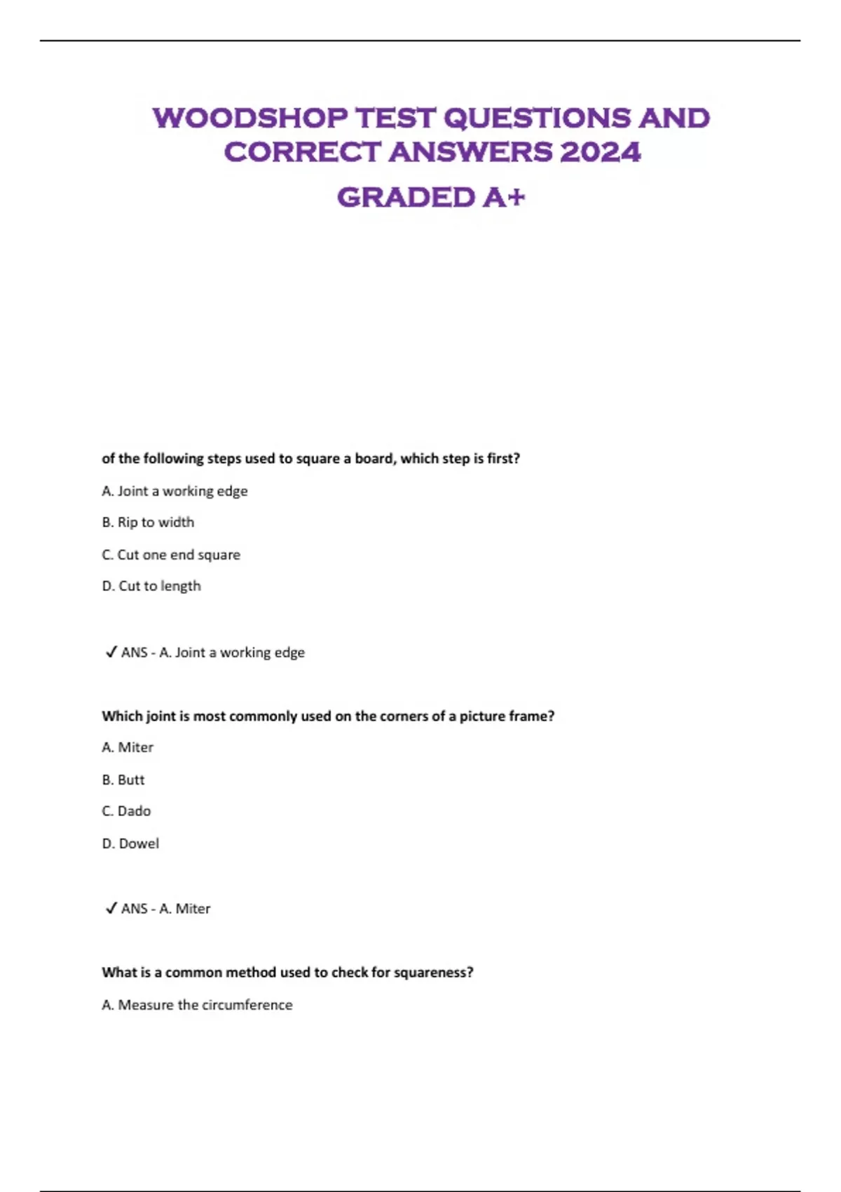 WOODSHOP TEST QUESTIONS AND CORRECT ANSWERS 2024 GRADED A+