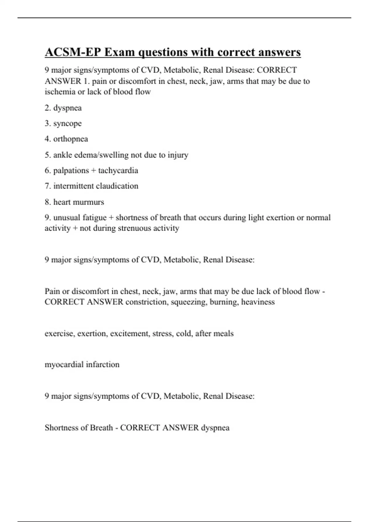 9 major signs/symptoms of CVD, Metabolic, Renal Disease: CORRECT ANSWER 1. pain or discomfort in chest, neck, jaw, arms that may be due to ischemia or lack of blood flow 2. dyspnea 3. syncope 4. orthopnea 5. ankle edema/swelling not due to injury 6. palpations + tachycardia 7. intermittent claudication 8. heart murmurs 9. unusual fatigue + shortness of breath that occurs during light exertion or normal activity + not during strenuous activity 9 major signs/symptoms of CVD, Metabolic, Renal Disease: Pain or discomfort in chest, neck, jaw, arms that may be due lack of blood flow - CORRECT ANSWER constriction, squeezing, burning, heaviness exercise, exertion, excitement, stress, cold, after meals myocardial infarction