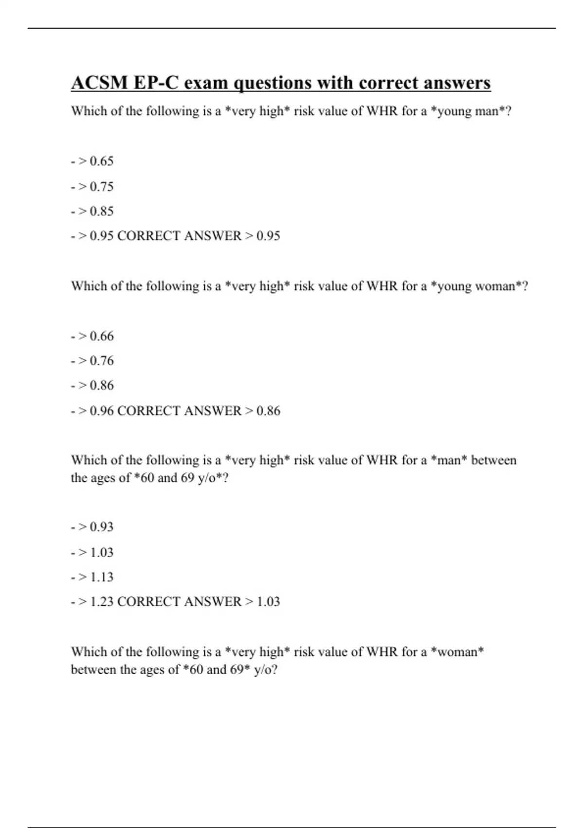 Which of the following is a *very high* risk value of WHR for a *young man*? - > 0.65 - > 0.75 - > 0.85 - > 0.95 CORRECT ANSWER > 0.95 Which of the following is a *very high* risk value of WHR for a *young woman*? - > 0.66 - > 0.76 - > 0.86 - > 0.96 CORRECT ANSWER > 0.86 Which of the following is a *very high* risk value of WHR for a *man* between the ages of *60 and 69 y/o*? - > 0.93 - > 1.03 - > 1.13 - > 1.23 CORRECT ANSWER > 1.03 Which of the following is a *very high* risk value of WHR for a *woman* between the ages of *60 and 69* y/o?
