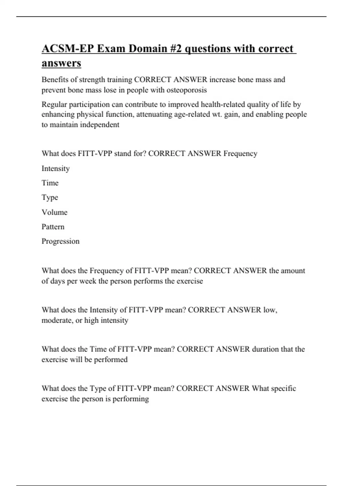 Benefits of strength training CORRECT ANSWER increase bone mass and prevent bone mass lose in people with osteoporosis Regular participation can contribute to improved health-related quality of life by enhancing physical function, attenuating age-related wt. gain, and enabling people to maintain independent What does FITT-VPP stand for? CORRECT ANSWER Frequency Intensity Time Type Volume Pattern Progression What does the Frequency of FITT-VPP mean? CORRECT ANSWER the amount of days per week the person performs the exercise What does the Intensity of FITT-VPP mean? CORRECT ANSWER low, moderate, or high intensity What does the Time of FITT-VPP mean? CORRECT ANSWER duration that the exercise will be performed What does the Type of FITT-VPP mean? CORRECT ANSWER What specific exercise the person is performing