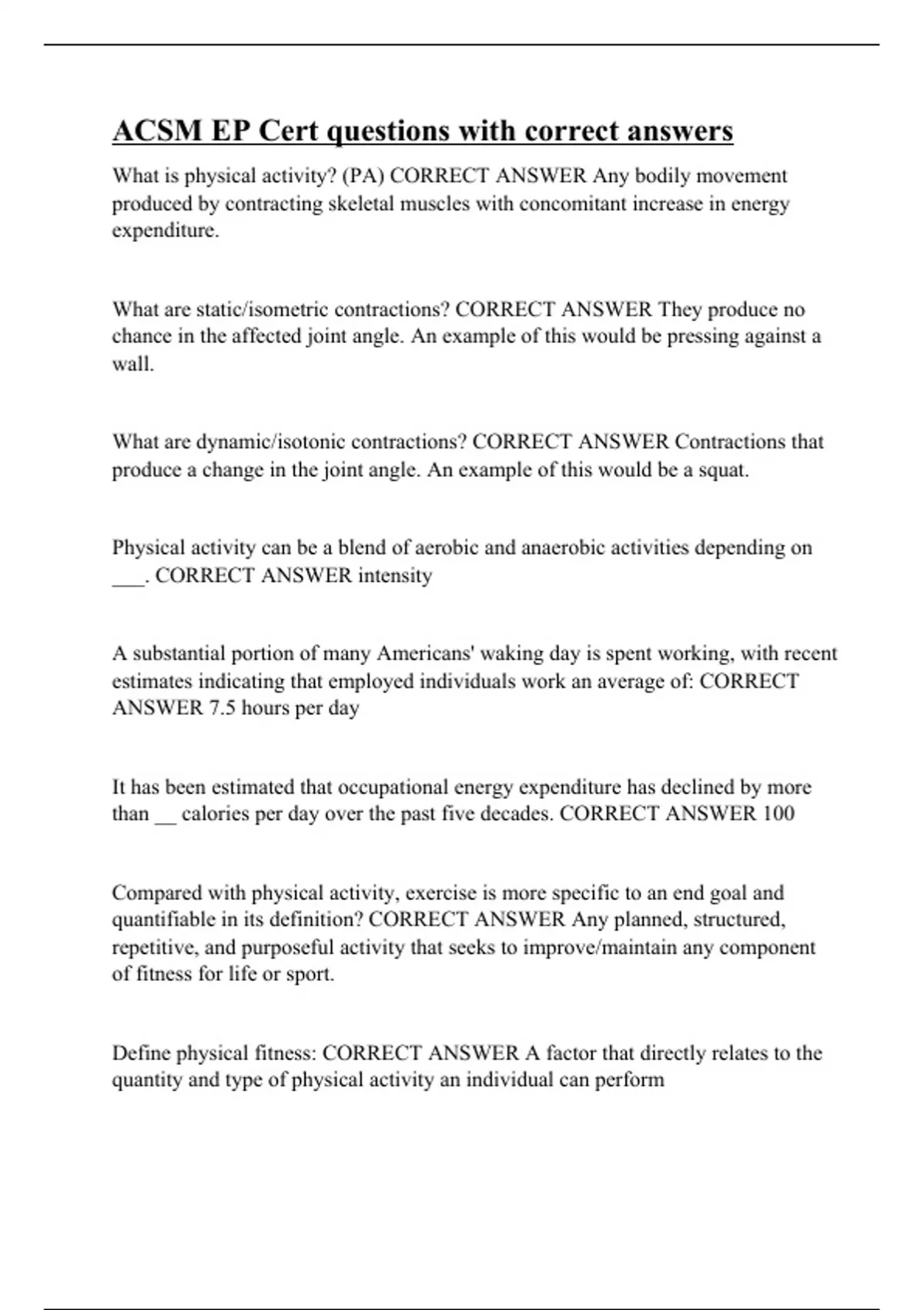 What is physical activity? (PA) CORRECT ANSWER Any bodily movement produced by contracting skeletal muscles with concomitant increase in energy expenditure. What are static/isometric contractions? CORRECT ANSWER They produce no chance in the affected joint angle. An example of this would be pressing against a wall. What are dynamic/isotonic contractions? CORRECT ANSWER Contractions that produce a change in the joint angle. An example of this would be a squat. Physical activity can be a blend of aerobic and anaerobic activities depending on ___. CORRECT ANSWER intensity A substantial portion of many Americans' waking day is spent working, with recent estimates indicating that employed individuals work an average of: CORRECT ANSWER 7.5 hours per day It has been estimated that occupational energy expenditure has declined by more than __ calories per day over the past five decades. CORRECT ANSWER 100 Compared with physical activity, exercise is more specific to an end goal and quantifiable in its definition? CORRECT ANSWER Any planned, structured, repetitive, and purposeful activity that seeks to improve/maintain any component of fitness for life or sport. Define physical fitness: CORRECT ANSWER A factor that directly relates to the quantity and type of physical activity an individual can perform