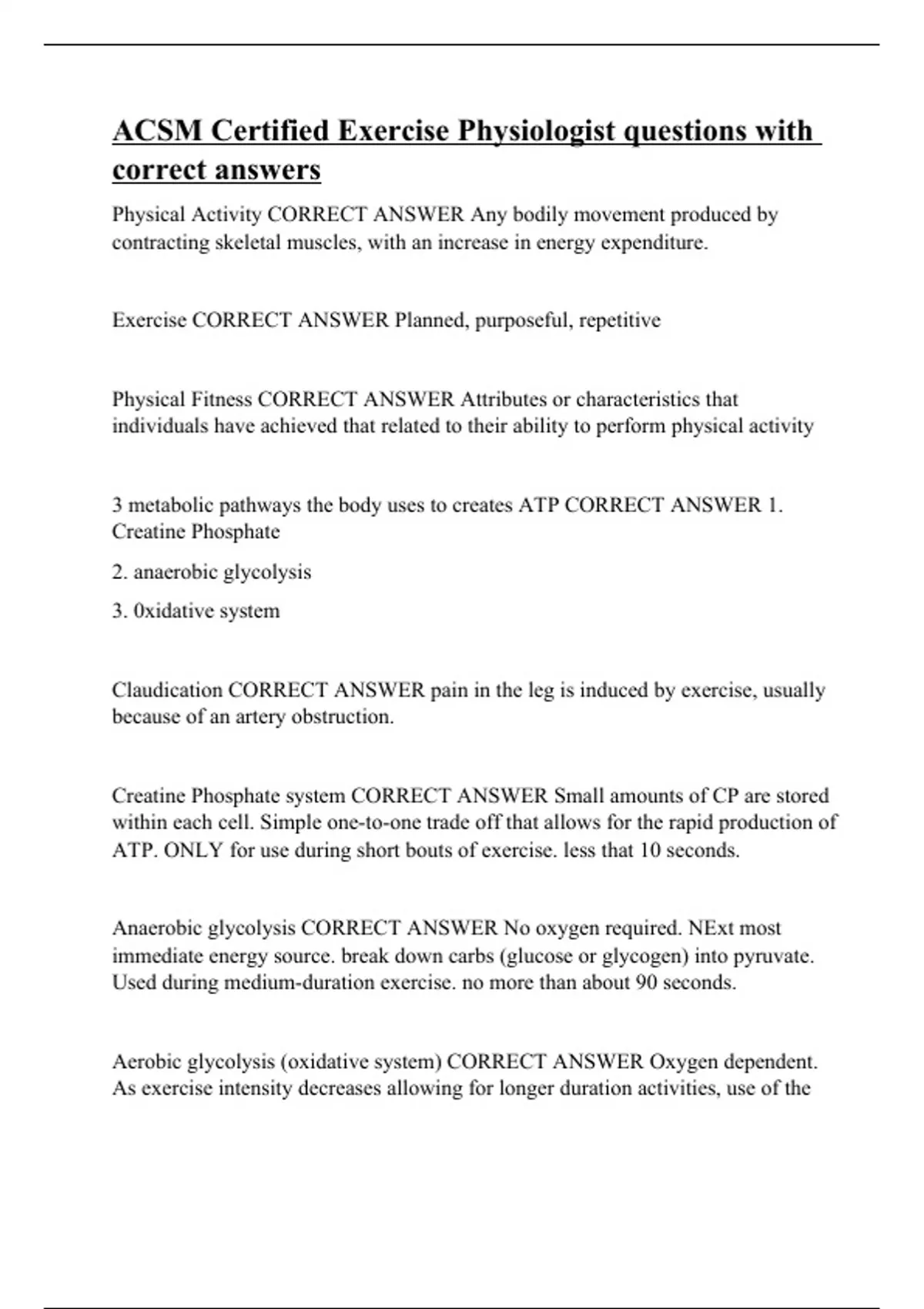Physical Activity CORRECT ANSWER Any bodily movement produced by contracting skeletal muscles, with an increase in energy expenditure. Exercise CORRECT ANSWER Planned, purposeful, repetitive Physical Fitness CORRECT ANSWER Attributes or characteristics that individuals have achieved that related to their ability to perform physical activity 3 metabolic pathways the body uses to creates ATP CORRECT ANSWER 1. Creatine Phosphate 2. anaerobic glycolysis 3. 0xidative system Claudication CORRECT ANSWER pain in the leg is induced by exercise, usually because of an artery obstruction. Creatine Phosphate system CORRECT ANSWER Small amounts of CP are stored within each cell. Simple one-to-one trade off that allows for the rapid production of ATP. ONLY for use during short bouts of exercise. less that 10 seconds. Anaerobic glycolysis CORRECT ANSWER No oxygen required. NExt most immediate energy source. break down carbs (glucose or glycogen) into pyruvate. Used during medium-duration exercise. no more