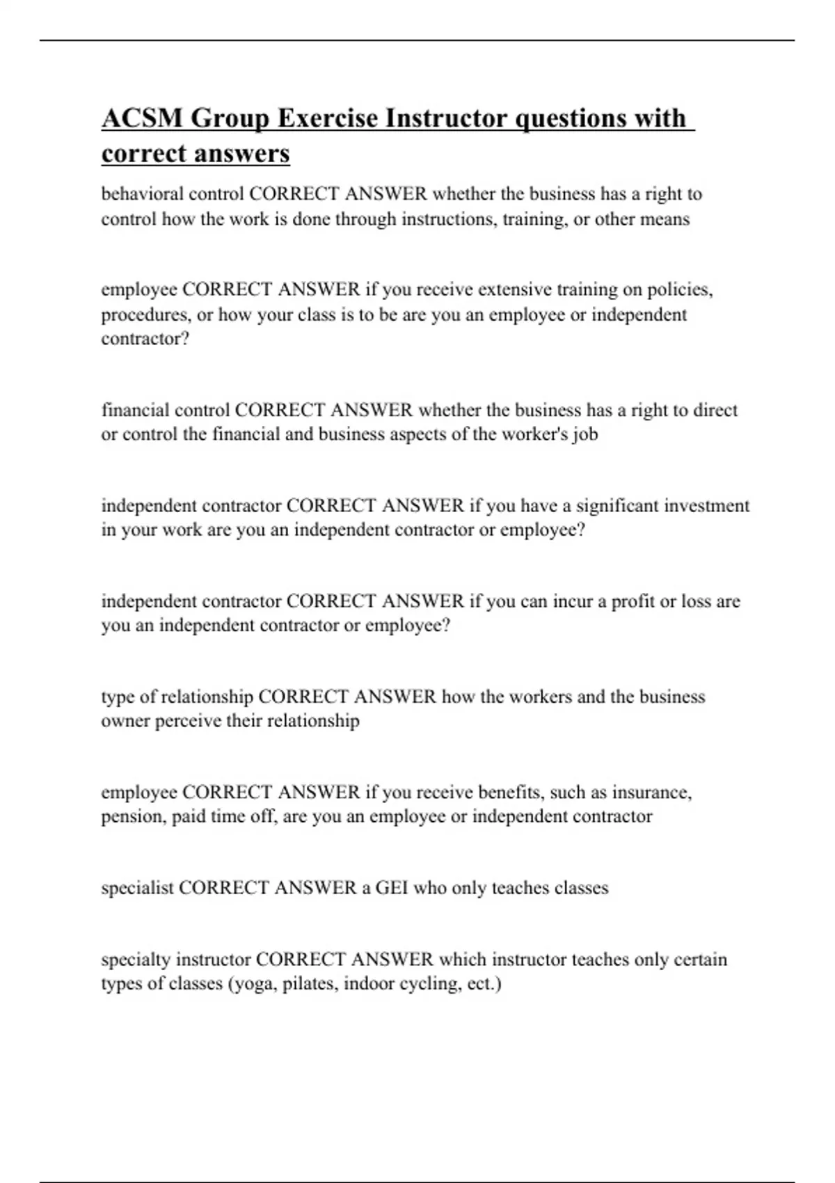 correct answers behavioral control CORRECT ANSWER whether the business has a right to control how the work is done through instructions, training, or other means employee CORRECT ANSWER if you receive extensive training on policies, procedures, or how your class is to be are you an employee or independent contractor? financial control CORRECT ANSWER whether the business has a right to direct or control the financial and business aspects of the worker's job independent contractor CORRECT ANSWER if you have a significant investment in your work are you an independent contractor or employee? independent contractor CORRECT ANSWER if you can incur a profit or loss are you an independent contractor or employee? type of relationship CORRECT ANSWER how the workers and the business owner perceive their relationship employee CORRECT ANSWER if you receive benefits, such as insurance, pension, paid time off, are you an employee or independent contractor specialist CORRECT ANSWER a GEI who only teaches classes specialty instructor CORRECT ANSWER which instructor teaches only certain types of classes (yoga, pilates, indoor cycling,