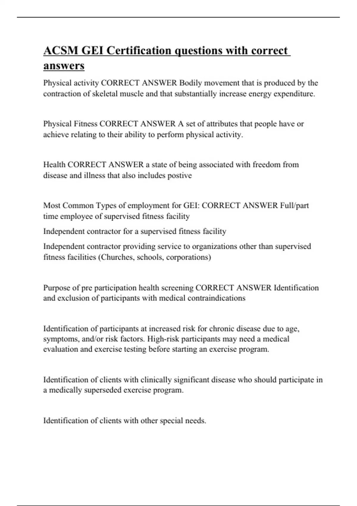 Physical activity CORRECT ANSWER Bodily movement that is produced by the contraction of skeletal muscle and that substantially increase energy expenditure. Physical Fitness CORRECT ANSWER A set of attributes that people have or achieve relating to their ability to perform physical activity. Health CORRECT ANSWER a state of being associated with freedom from disease and illness that also includes postive Most Common Types of employment for GEI: CORRECT ANSWER Full/part time employee of supervised fitness facility Independent contractor for a supervised fitness facility Independent contractor providing service to organizations other than supervised fitness facilities (Churches, schools, corporations) Purpose of pre participation health screening CORRECT ANSWER Identification and exclusion of participants with medical contraindications Identification of participants at increased risk for chronic disease due to age, symptoms, and/or risk factors. High-risk participants may need a medical evaluation and exercise testing before startin