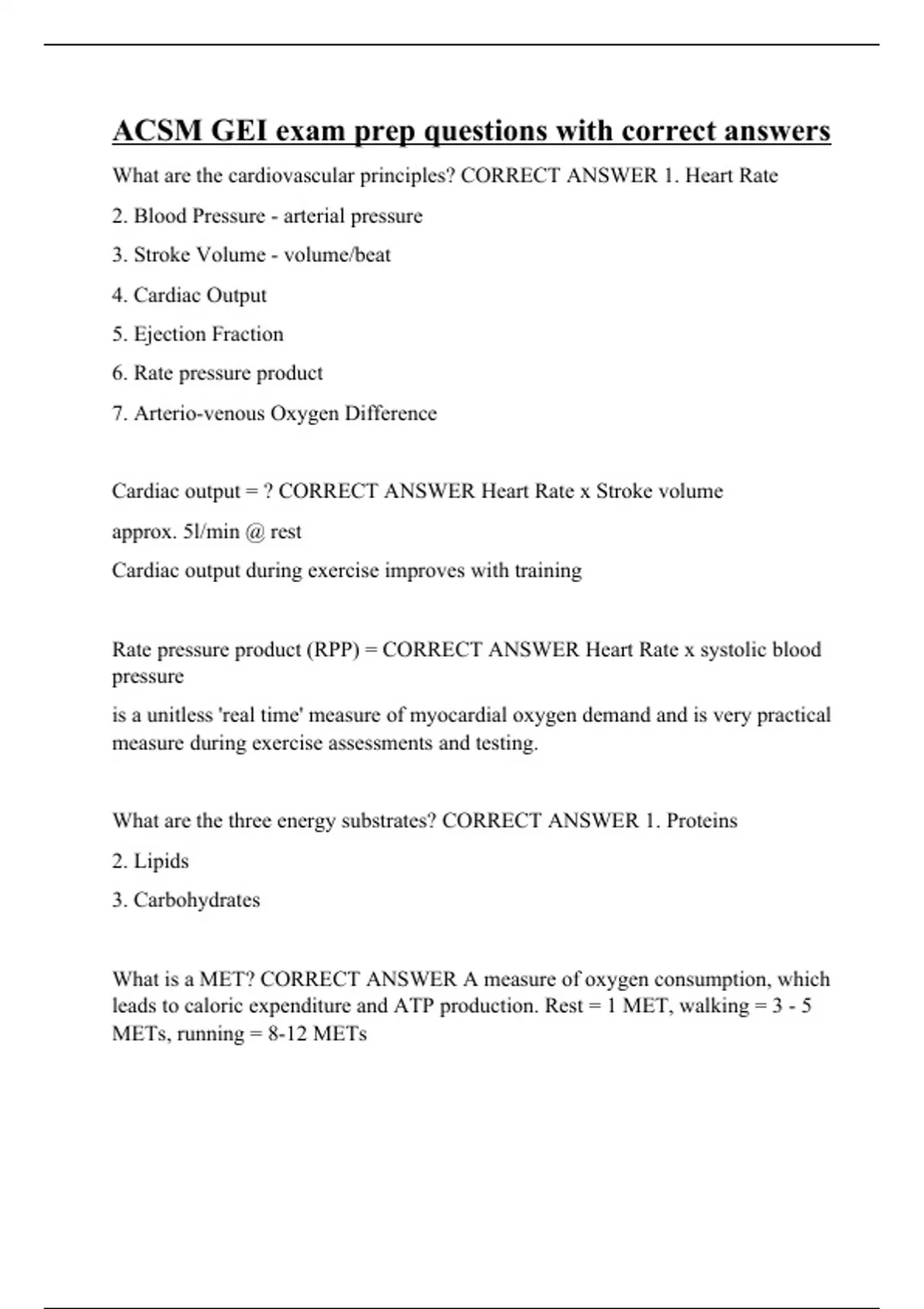 What are the cardiovascular principles? CORRECT ANSWER 1. Heart Rate 2. Blood Pressure - arterial pressure 3. Stroke Volume - volume/beat 4. Cardiac Output 5. Ejection Fraction 6. Rate pressure product 7. Arterio-venous Oxygen Difference Cardiac output = ? CORRECT ANSWER Heart Rate x Stroke volume approx. 5l/min @ rest Cardiac output during exercise improves with training Rate pressure product (RPP) = CORRECT ANSWER Heart Rate x systolic blood pressure is a unitless 'real time' measure of myocardial oxygen demand and is very practical measure during exercise assessments and testing. What are the three energy substrates? CORRECT ANSWER 1. Proteins 2. Lipids 3. Carbohydrates