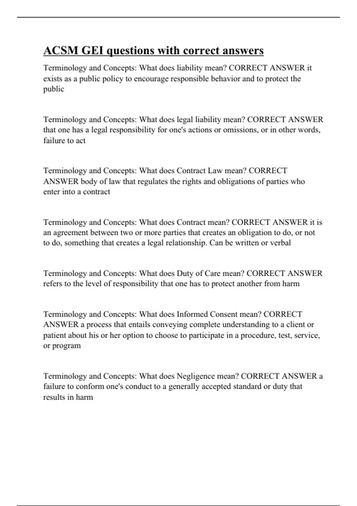 Terminology and Concepts: What does liability mean? CORRECT ANSWER it exists as a public policy to encourage responsible behavior and to protect the public Terminology and Concepts: What does legal liability mean? CORRECT ANSWER that one has a legal responsibility for one's actions or omissions, or in other words, failure to act Terminology and Concepts: What does Contract Law mean? CORRECT ANSWER body of law that regulates the rights and obligations of parties who enter into a contract Terminology and Concepts: What does Contract mean? CORRECT ANSWER it is an agreement between two or more parties that creates an obligation to do, or not to do, something that creates a legal relationship. Can be written or verbal Terminology and Concepts: What does Duty of Care mean? CORRECT ANSWER refers to the level of responsibility that one has to protect another from harm Terminology and Concepts: What does Informed Consent mean? CORRECT ANSWER a process that entails conveying complete understanding to a client or patient about his or her option to choose to participate in a procedure, test, service, or program Terminology and Concepts: What does Negligence mean? CORRECT ANSWER a failure to conform one's cond